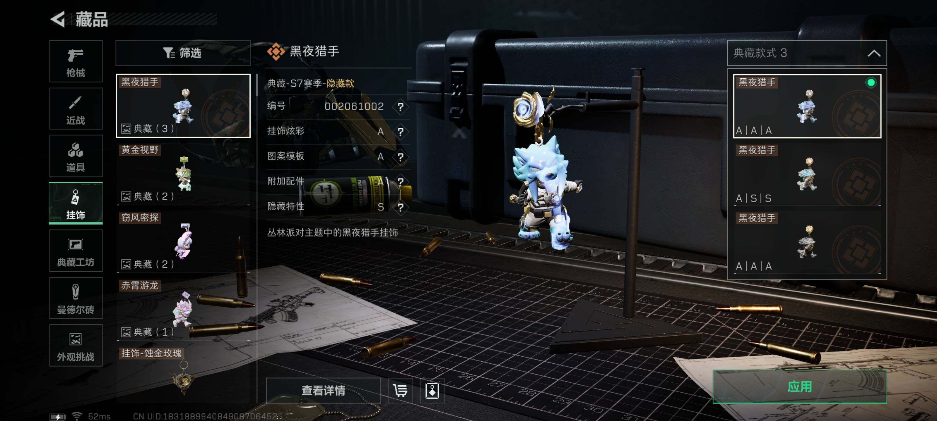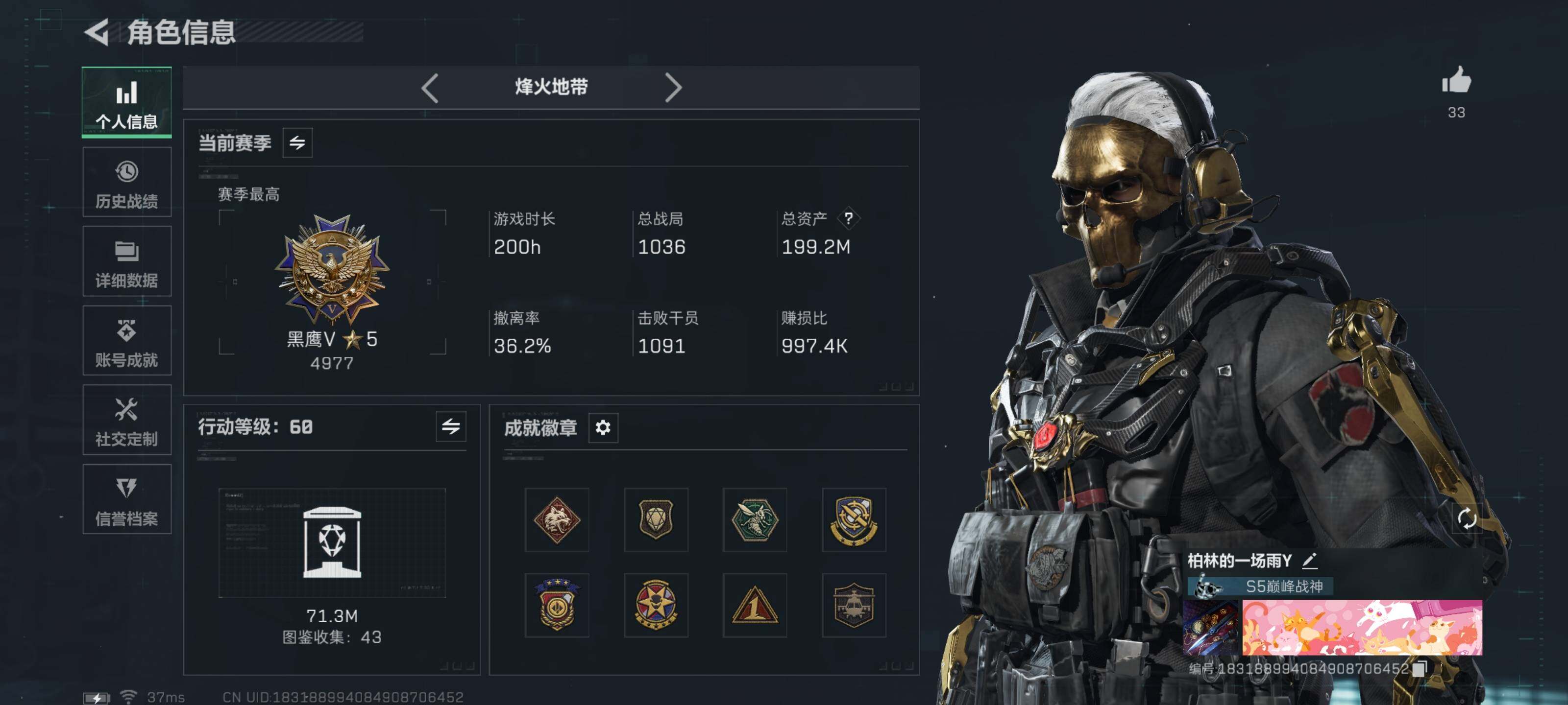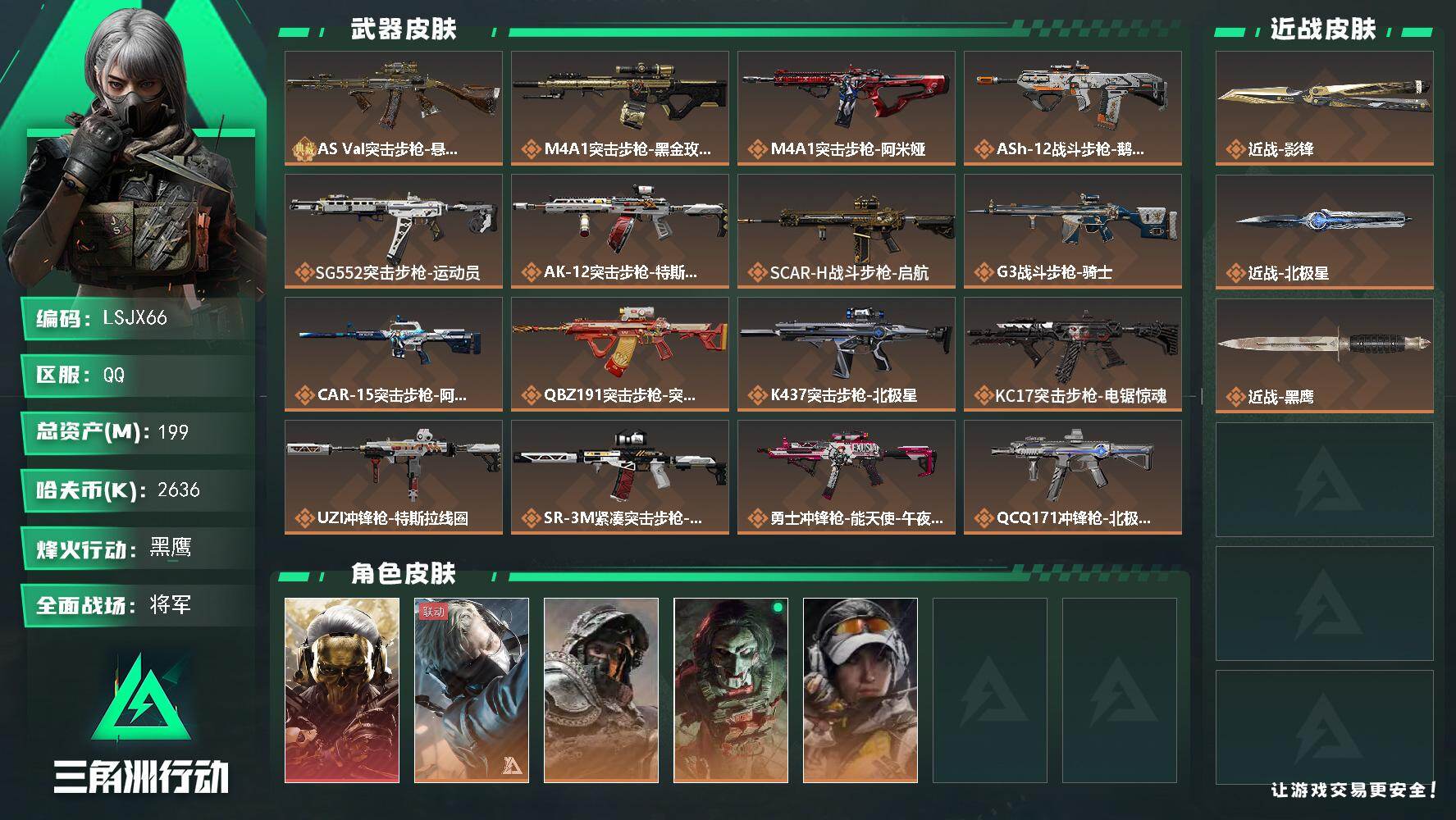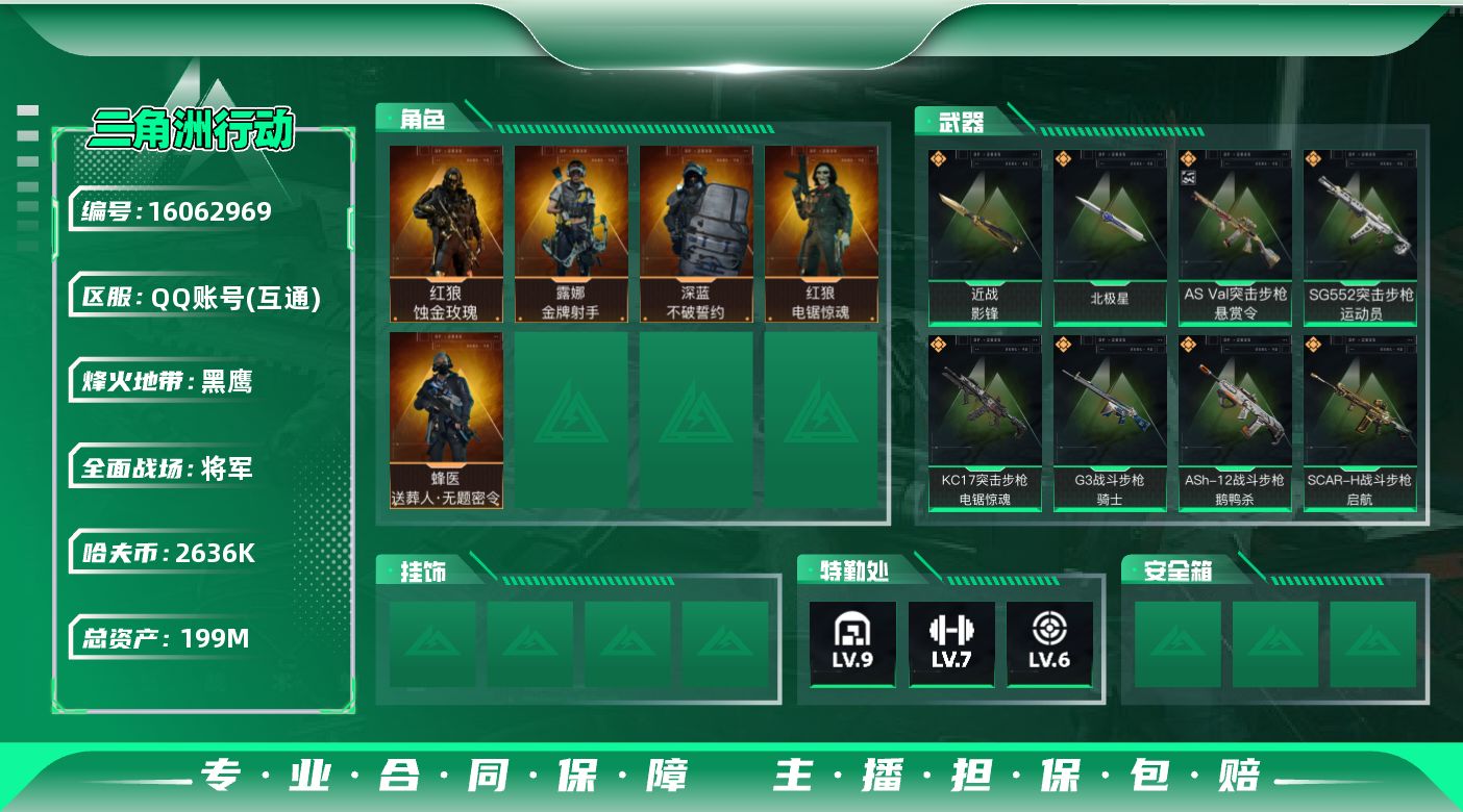 [16062969]典藏武器优品A【特价出售/店主推荐】199m总资产-2636k哈伏币-60烽火等级-黑鹰-50战场等级-将军 【干员外观】:红狼-蚀金玫瑰,蜂医-送葬人·无题密令,深蓝-不破誓约,红狼-电锯惊魂,露娜-金牌射手 【近战皮肤】:近战-影锋,近战-北极星,近战-黑鹰 【典藏外观】:AS Val突击步枪-悬赏令 【传说外观】:M4A1突击步枪-蚀金玫瑰,M4A1突击步枪-阿米娅,ASh-12战斗步枪-鹅鸭杀,SG552突击步枪-运动员,AK-12突击步枪-特斯拉线圈,SCAR-H战斗步枪-启航,G3战斗步枪-骑士,CAR-15突击步枪-阿米娅,腾龙突击步枪-捞点薯条,K437突击步枪-北极星,KC17突击步枪-电锯惊魂,UZI冲锋枪-特斯拉线圈,SR-3M紧凑突击步枪-特斯拉线圈,勇士冲锋枪-能天使-午夜邮差,QCQ171冲锋枪-北极星,QCQ171冲锋枪-鹅鸭杀,725双管霰弹枪-送葬人-无题密令,M250通用机枪-骑士之心,QJB201轻机枪-鹅鸭杀,AWM狙击步枪-捞点薯条,93R-捞点薯条,复合弓-黑·天际线 【史诗外观】:AKM突击步枪-林中猎手,QBZ95-1突击步枪-曙光,ASh-12战斗步枪-无极限,M16A4突击步枪-竞赛选手,AUG突击步枪-蝮蛇,M7战斗步枪-百步穿杨,SG552突击步枪-深海恐惧,SCAR-H战斗步枪-囚徒,G3战斗步枪-流沙送葬,AS Val突击步枪-百步穿杨,腾龙突击步枪-无垢,腾龙突击步枪-猎鳄行动,K437突击步枪-守护者,MP5冲锋枪-深海恐惧,MP5冲锋枪-战术竞备,MP5冲锋枪-竞技风,Vector冲锋枪-阿萨拉文明,Vector冲锋枪-猎鳄行动,Vector冲锋枪-百步穿杨,SR-3M紧凑突击步枪-荒野求生,SR-3M紧凑突击步枪-战术竞备,勇士冲锋枪-深海恐惧,勇士冲锋枪-工业狂潮,MP7冲锋枪-无垢,MP7冲锋枪-守护者,M1014霰弹枪-林中猎手,S12K霰弹枪-曙光,PKM通用机枪-蝮蛇,PKM通用机枪-荒野求生,M250通用机枪-囚徒,Mini-14射手步枪-守护者,SVD狙击步枪-阿萨拉工艺,SVD狙击步枪-暗夜猎手,SVD狙击步枪-荒野求生,M14射手步枪-工业狂潮,PSG-1射手步枪-无垢,SV-98狙击步枪-林中猎手,SV-98狙击步枪-囚徒,SV-98狙击步枪-猎鳄行动,M700狙击步枪-竞技风