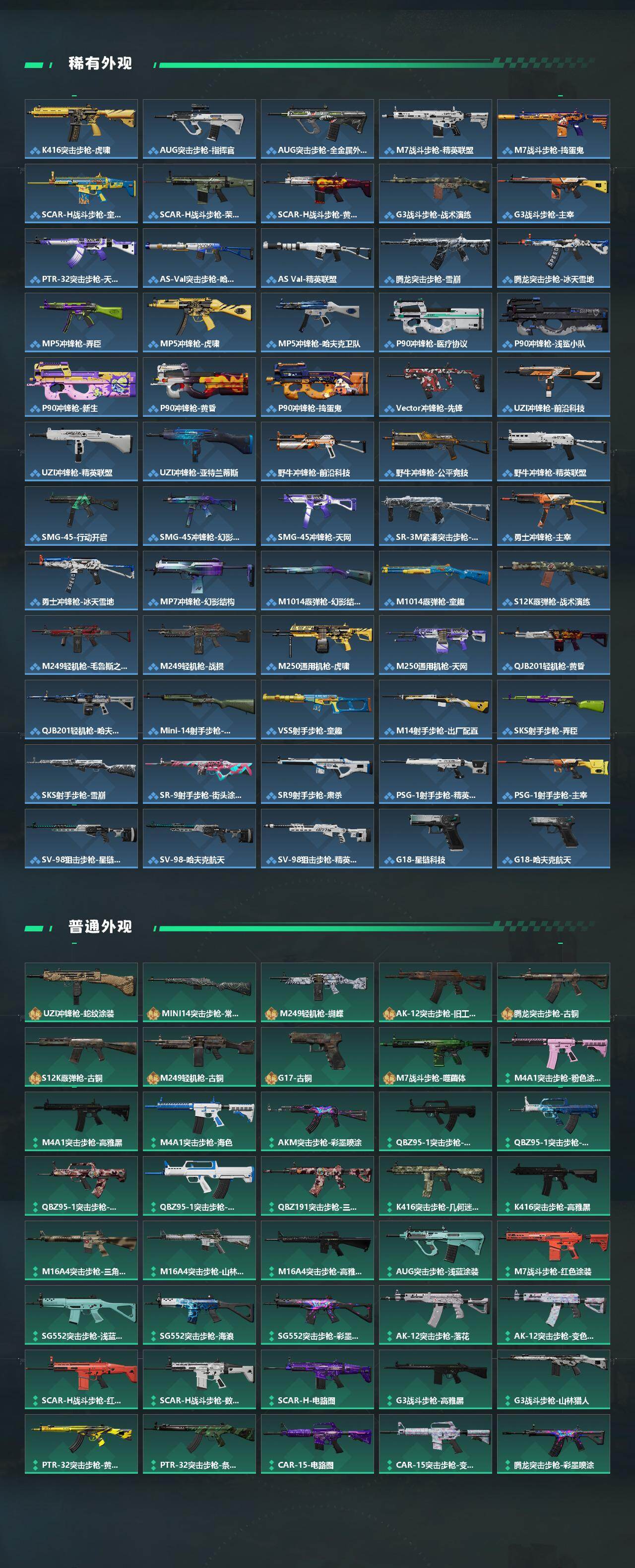 【传说外观】:M4A1突击步枪-蚀金玫瑰,M4A1突击步枪-阿米娅,ASh-12战斗步枪-鹅鸭杀,SG552突击步枪-运动员,AK-12突击步枪-特斯拉线圈,SCAR-H战斗步枪-启航,G3战斗步枪-骑士,CAR-15突击步枪-阿米娅,腾龙突击步枪-捞点薯条,K437突击步枪-北极星,KC17突击步枪-电锯惊魂,UZI冲锋枪-特斯拉线圈,SR-3M紧凑突击步枪-特斯拉线圈,勇士冲锋枪-能天使-午夜邮差,QCQ171冲锋枪-北极星,QCQ171冲锋枪-鹅鸭杀,725双管霰弹枪-送葬人-无题密令,M250通用机枪-骑士之心,QJB201轻机枪-鹅鸭杀,AWM狙击步枪-捞点薯条,93R-捞点薯条,复合弓-黑·天际线