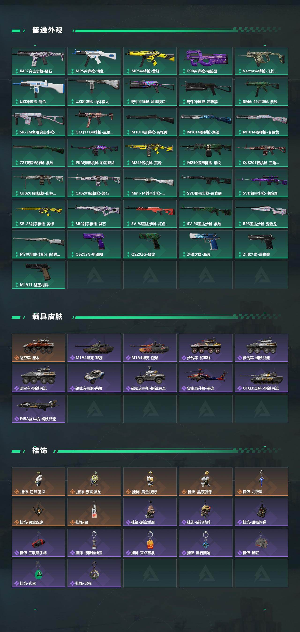【史诗外观】:AKM突击步枪-林中猎手,QBZ95-1突击步枪-曙光,ASh-12战斗步枪-无极限,M16A4突击步枪-竞赛选手,AUG突击步枪-蝮蛇,M7战斗步枪-百步穿杨,SG552突击步枪-深海恐惧,SCAR-H战斗步枪-囚徒,G3战斗步枪-流沙送葬,AS Val突击步枪-百步穿杨,腾龙突击步枪-无垢,腾龙突击步枪-猎鳄行动,K437突击步枪-守护者,MP5冲锋枪-深海恐惧,MP5冲锋枪-战术竞备,MP5冲锋枪-竞技风,Vector冲锋枪-阿萨拉文明,Vector冲锋枪-猎鳄行动,Vector冲锋枪-百步穿杨,SR-3M紧凑突击步枪-荒野求生,SR-3M紧凑突击步枪-战术竞备,勇士冲锋枪-深海恐惧,勇士冲锋枪-工业狂潮,MP7冲锋枪-无垢,MP7冲锋枪-守护者,M1014霰弹枪-林中猎手,S12K霰弹枪-曙光,PKM通用机枪-蝮蛇,PKM通用机枪-荒野求生,M250通用机枪-囚徒,Mini-14射手步枪-守护者,SVD狙击步枪-阿萨拉工艺,SVD狙击步枪-暗夜猎手,SVD狙击步枪-荒野求生,M14射手步枪-工业狂潮,PSG-1射手步枪-无垢,SV-98狙击步枪-林中猎手,SV-98狙击步枪-囚徒,SV-98狙击步枪-猎鳄行动,M700狙击步枪-竞技风