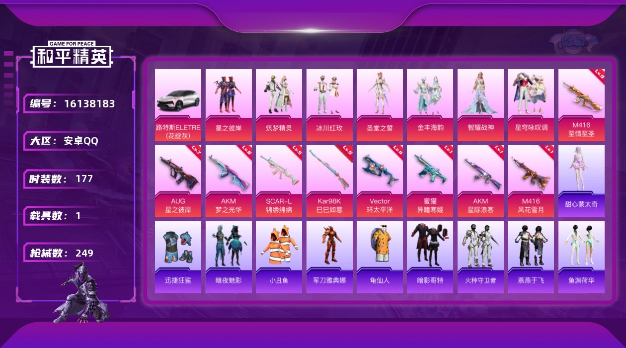 [16138183]【特价出售/店主推荐】安卓 手Q-7粉装-9特效枪-1载具-2粉色飞行器-78867热力值-13王牌印记-177套装-249枪皮 【热门品类】:套装-小丑鱼,角色-军刀雅典娜,套装-龟仙人,套装-暗影哥特 【粉色套装】:粉装-星之彼岸,粉装-筑梦精灵,粉装-冰川红玫,角色-圣堂之誓,粉装-金丰海韵,角色-智耀战神,粉装-星穹咏叹调 【粉色枪皮等级】:AKM-梦之光华(六级),AKM-星际浪客(一级),SCAR-L-锦绣绵绵(五级),M416-风花雪月(一级),M416-至情至圣(九级),AUG-星之彼岸(七级),蜜獾-异瞳寒姬(一级),Vector-环太平洋(四级),Kar98K-巳巳如意(五级) 【粉色载具】:路特斯ELETRE(花绽灰) 【粉色枪皮】:AKM-梦之光华,AKM-星际浪客,SCAR-L-锦绣绵绵,M416-风花雪月,M416-至情至圣,AUG-星之彼岸,蜜獾-异瞳寒姬,Vector-环太平洋,Kar98K-巳巳如意 【粉色飞行器】:冰川粉黛飞行器 【粉色降落伞】:绝对恒星降落伞,至尊龙雀降落伞,春暖花开降落伞,夏日绵绵冰降落伞,星之彼岸降落伞,怪笑疯兔降落伞,暗夜玫瑰降落伞,齐天大圣降落伞,橘柚倾心降落伞,绒雪飘舞降落伞,垂柳戏鸭降落伞,旋转彩虹降落伞,第五大道降落伞,闲梦青缨降落伞,炫光之旅降落伞,精灵梦叶罗丽降落伞,鬼刀降落伞,樱桃泡泡降落伞,幻彩电音降落伞,极意拳锋降落伞,炫彩糖果降落伞 【稀有套装】:套装-龟仙人,角色-甜心蒙太奇,套装-雪国风尚,套装-火种守卫者,套装-燕燕于飞,套装-鱼渊荷华,套装-旋风灵鼠,套装-粉恋花,套装-紫幽梦,套装-蓝冰羽,套装-星影赞美诗,套装-星渊小夜曲,套装-极速光影,套装-云朵鹅,套装-雪绒豹,角色-灵公主,套装-炫彩糖果 【稀有枪皮】:AUG-冰晶雪宝,AKM-夜灯,AKM-星之彼岸,AKM-灼热熔岩,AKM-环太平洋,AKM-生命誓言,AKM-破晓战魂,AKM-萌趣颜团子,AKM-虎虎生威,AKM-霓虹街区,AKM-龙的传人,M16A4-幻世战舞者,M16A4-甜心亚梦,M16A4-生命誓言,SCAR-L-炫彩节奏,SCAR-L-玉兔迎春,SCAR-L-红色方程式,M416-糯团青竹,M416-红色方程式,M416-绯红前夜,M416-蓝色火焰,GROZA-恐龙拽拽,GROZA-懵萌河马,GROZ