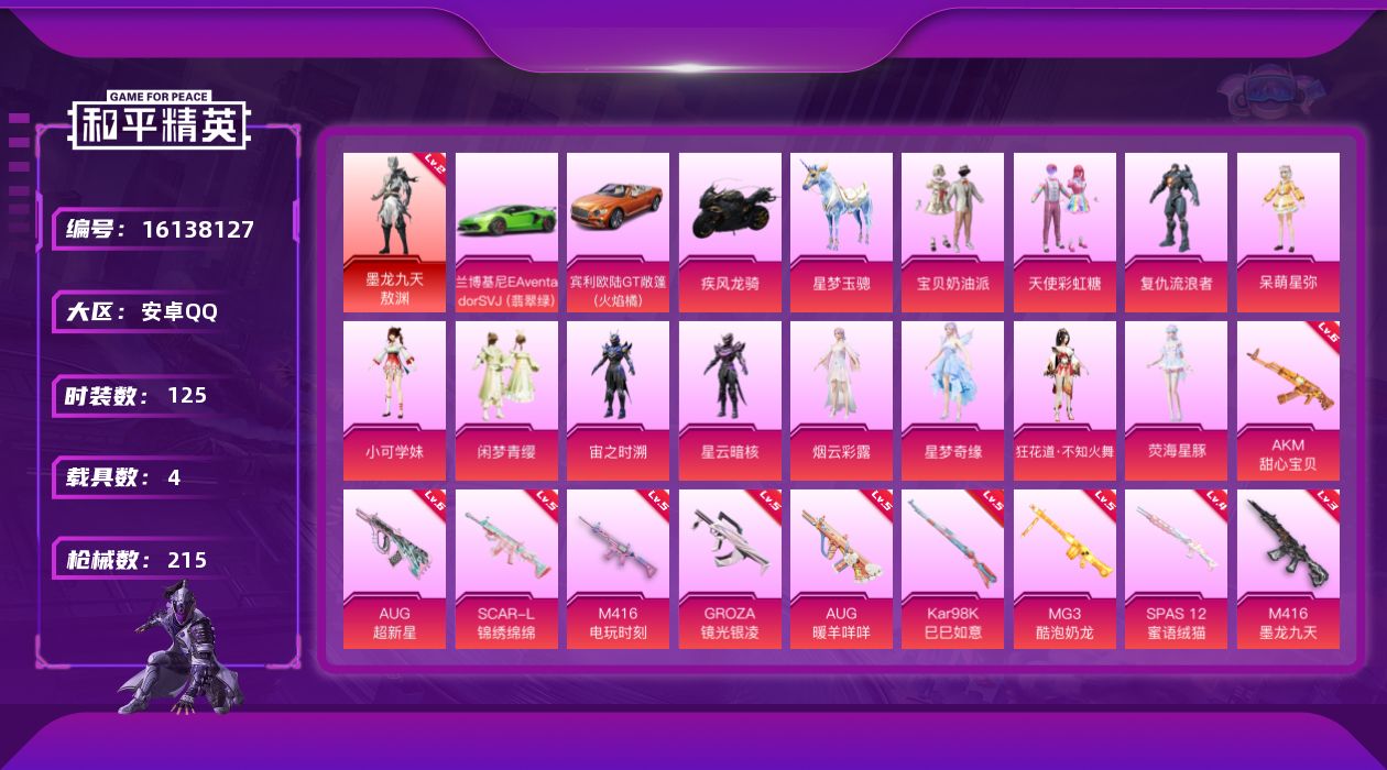 [16138127]【特价出售/店主推荐】 安卓 手Q-1神装-12粉装-11特效枪-4载具-5粉色飞行器-71163热力值-11王牌印记-125套装-215枪皮