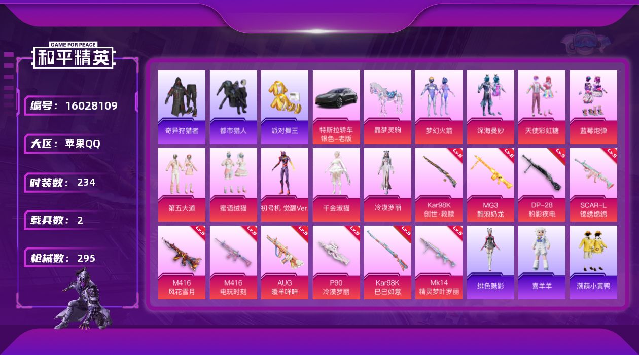 [16028109]【特价出售/店主推荐】苹果 手Q-9粉装-10特效枪-2载具-7粉色飞行器-9.9w热力值-14王牌印记-234套装-295枪皮 【热门品类】:粉装-梦幻火箭,套装-都市猎人,套装-派对舞王,套装-小丑鱼,套装-奇异狩猎者,角色-2B战斗服款,套装-龟仙人,套装-潮萌小黄鸭,套装-暗影哥特,套装-浪漫波比,角色-Mark.06 【粉色套装】:粉装-深海曼妙,粉装-天使彩虹糖,粉装-梦幻火箭,粉装-蓝莓炮弹,粉装-第五大道,粉装-蜜语绒猫,角色-初号机 觉醒Ver.,角色-千金淑猫,角色-冷漠罗丽 【粉色枪皮等级】:SCAR-L-锦绣绵绵(五级),M416-风花雪月(五级),M416-电玩时刻(五级),AUG-暖羊咩咩(五级),P90-冷漠罗丽(五级),Kar98K-创世·救赎(六级),Kar98K-巳巳如意(五级),Mk14-精灵梦叶罗丽(五级),DP-28-豹影疾电(五级),MG3-酷泡奶龙(六级) 【粉色载具】:特斯拉Model 3(冷光银),晶梦灵驹 【粉色枪皮】:SCAR-L-锦绣绵绵,M416-风花雪月,M416-电玩时刻,AUG-暖羊咩咩,P90-冷漠罗丽,Kar98K-创世·救赎,Kar98K-巳巳如意,Mk14-精灵梦叶罗丽,DP-28-豹影疾电,MG3-酷泡奶龙 【粉色飞行器】:深海曼妙飞行器,梦幻火箭飞行器,神秘黑猫飞行器,镜域双华-灵镜之阶,龙翔九天飞行器,深渊漩涡飞行器 【粉色降落伞】:快乐主宰降落伞,甜心宝贝降落伞,梦幻火箭降落伞,华贵君王降落伞,四圣焕新降落伞,花间之火降落伞,锦绣火鲤降落伞,垂柳戏鸭降落伞,暗夜鎏金降落伞,第五大道降落伞,炫光之旅降落伞,沙丘之主降落伞,蜜语绒猫降落伞,江南烟雨降落伞,精灵梦叶罗丽降落伞,墨龙九天降落伞,冠军兔兔降落伞,初号机 觉醒Ver.降落伞,金丰海韵降落伞,临安公主降落伞,冷漠罗丽降落伞,极意拳锋降落伞,炫彩糖果降落伞 【稀有套装】:套装-龟仙人,套装-巳巳如意,套装-雪国风尚,套装-雏菊兔兔,套装-萝兰蝴蝶,套装-小熊娃娃,角色-达芬奇,套装-糖糖葫芦,套装-青团波波,套装-棉花软糖,角色-怀庆长公主,套装-燕燕于飞,套装-鱼渊荷华,套装-粉恋花,套装-紫幽梦,套装-蓝冰羽,套装-霓虹热舞,套装-彩虹兔,套装-云朵鹅,套装-雪绒豹,角色-时希公主,角色-灵公主,角色-乐音,玩偶服-喜羊羊,角色-