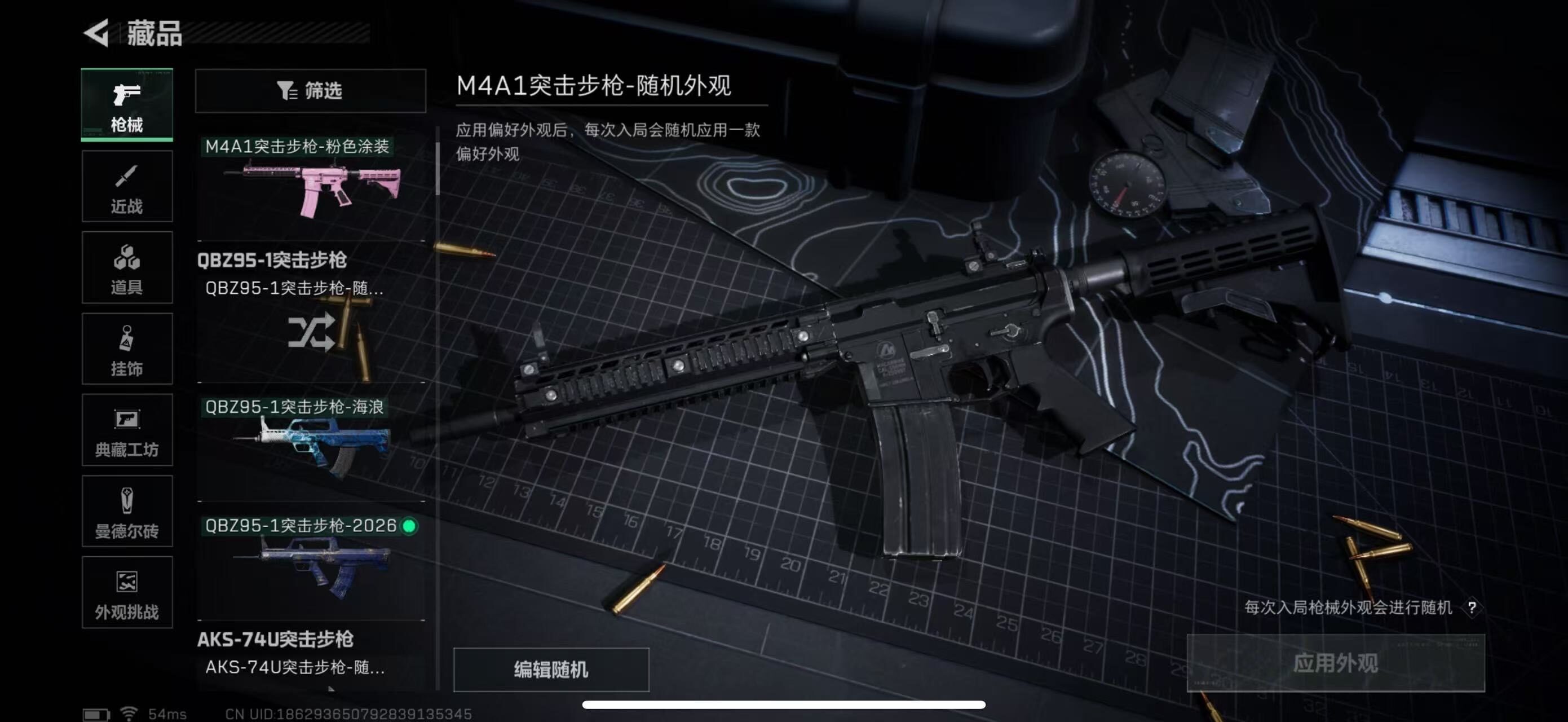 【普通外观】:M4A1突击步枪-粉色涂装,M4A1突击步枪-高雅黑,QBZ95-1突击步枪-海浪,K416突击步枪-几何迷彩,M16A4突击步枪-三角洲力量,AUG突击步枪-浅蓝涂装,M7战斗步枪-红色涂装,SG552突击步枪-海浪,UZI冲锋枪-海色,M1014霰弹枪-海浪,M249轻机枪-黄蜂,SR-25射手步枪-黄蜂,沙漠之鹰-海浪