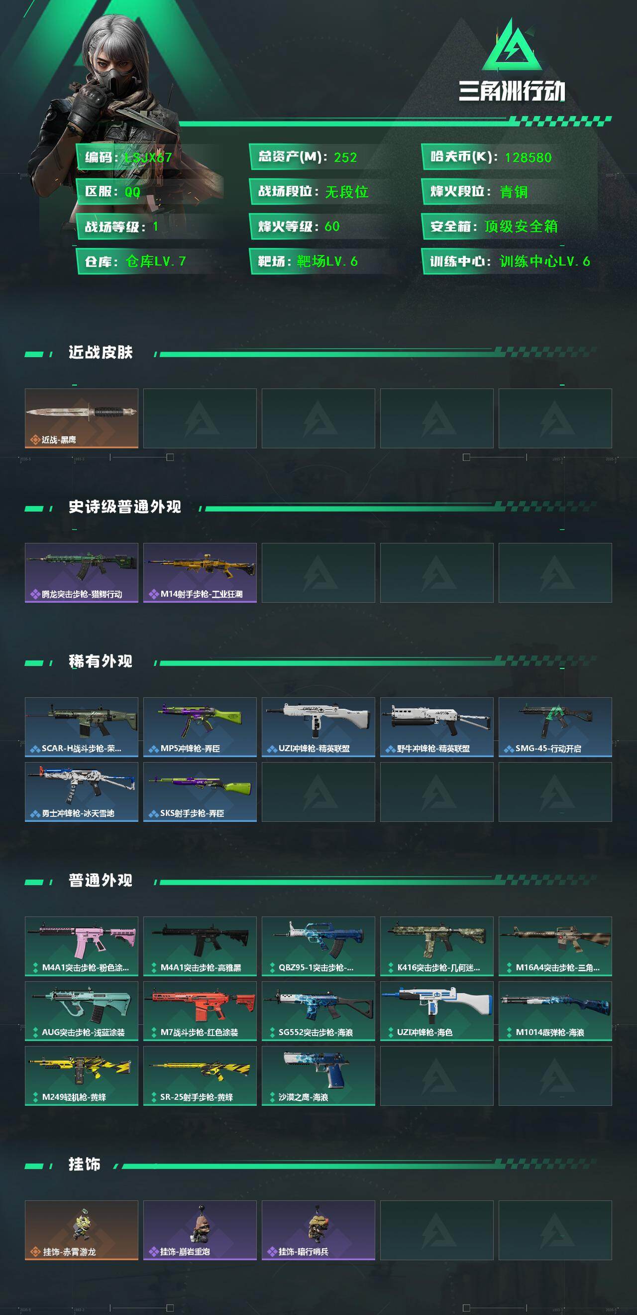 [16143430]【特价出售/店主推荐】252m总资产-128580k哈伏币-60烽火等级-青铜-1战场等级-无军衔 【近战皮肤】:近战-黑鹰 【史诗外观】:腾龙突击步枪-猎鳄行动,M14射手步枪-工业狂潮 【稀有外观】:SCAR-H战斗步枪-荣耀列队,MP5冲锋枪-弄臣,UZI冲锋枪-精英联盟,野牛冲锋枪-精英联盟,SMG-45-行动开启,勇士冲锋枪-冰天雪地,SKS射手步枪-弄臣 【普通外观】:M4A1突击步枪-粉色涂装,M4A1突击步枪-高雅黑,QBZ95-1突击步枪-海浪,K416突击步枪-几何迷彩,M16A4突击步枪-三角洲力量,AUG突击步枪-浅蓝涂装,M7战斗步枪-红色涂装,SG552突击步枪-海浪,UZI冲锋枪-海色,M1014霰弹枪-海浪,M249轻机枪-黄蜂,SR-25射手步枪-黄蜂,沙漠之鹰-海浪 【挂饰】:挂饰-赤霄游龙,挂饰-崩岩重炮*4,挂饰-暗行哨兵*2