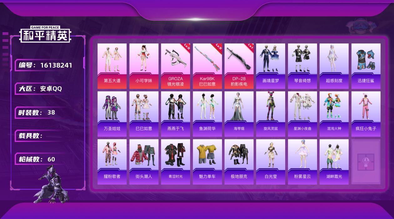 [16138241]【店主推荐捡漏号!可直接换绑】地铁满天赋 安卓 手Q-2粉装-3特效枪-0载具-0粉色飞行器-16731热力值-1王牌印记-38套装-60枪皮