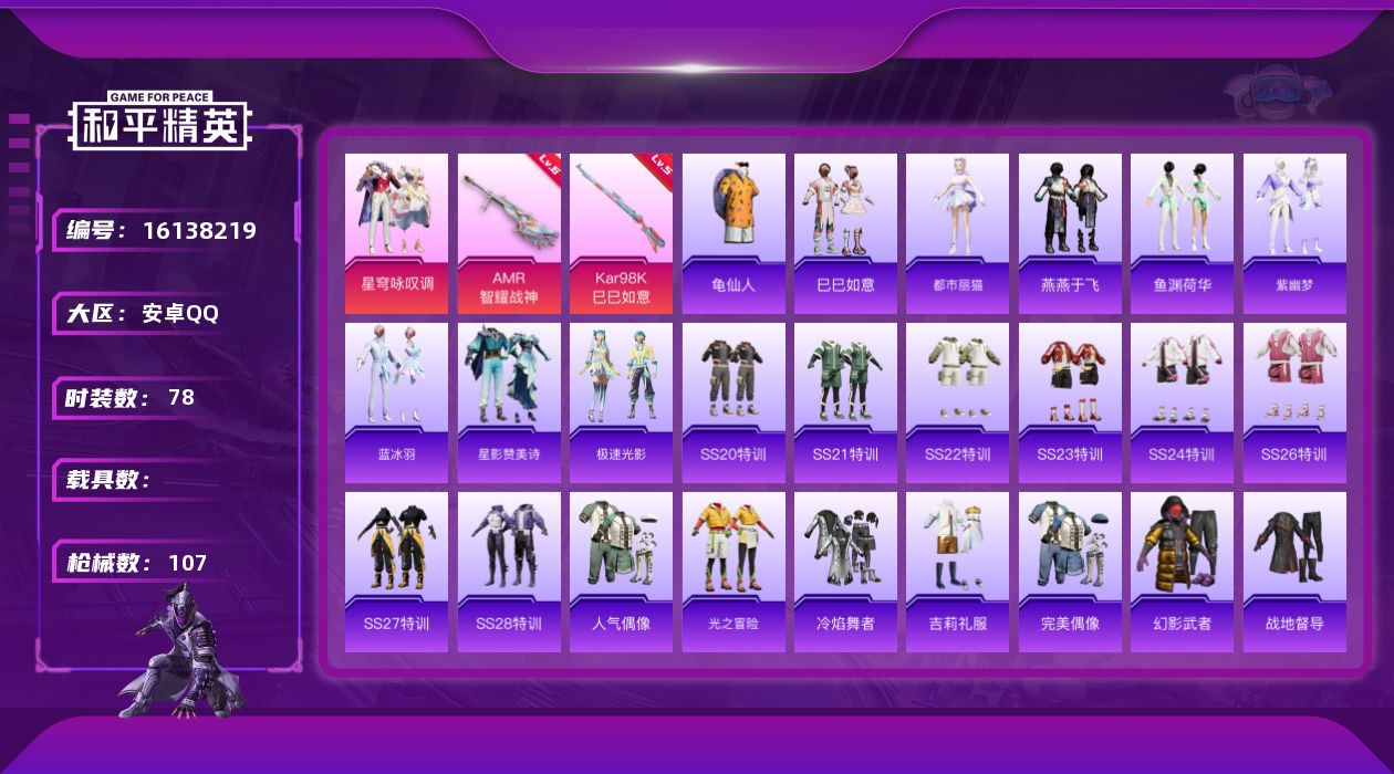- [16334434]山东一区-27V-4王者-0炫金 【传说角色】:传说影煞 【热门武器】:M200-幻神,M4A1-黑骑士,COP 357-幻灵,沙鹰-修罗 【皮肤】:幻神-纸灯龙皮肤,幻神-电流骇客 皮肤,雷神-暗月,火麒麟-心动糖果,黑骑士-暗月 【角色】:司雨,王者玲珑,奇洋探员,嘉年华灵狐,娟娟,葵-赛博朋克,灵狐者-职业经理,斯沃特-X 【人偶武器】:AWM-灵狐-15周年嘉年华,迷你牛牛 【挑战大师】:激光毁灭者III-白马银枪*2 【英雄级武器】:AK47-火麒麟,M4A1-雷神,M4A1-黑骑士,AN94-超新星,无影-神兵利器,黑武士-锦绣游龙,超新星-热带奇洋,QBZ-03-王者蔷薇-觉醒版,王者龙血-觉醒版,王者芳薇-觉醒版,AWM-裁决,M200-幻神,沙鹰-修罗,沙鹰-天神*3,COP 357-幻灵,龙啸,麒麟刺,龙啸-热带奇洋,高爆手雷-幻灵*6,手雷-热带奇洋,闪光弹-幻灵,烟雾弹-幻灵 【道具】:CFS限定背包,奇洋探员-海龟背包,热带奇洋炫彩背包,超级背包,绿色巨人,灵魂忍者,迷雾幽灵,夺命之镰,防化服*2,金色流光-枪王排位*2,星辰流光-枪王排位,枪王排位28赛季金色流光,枪王排位29赛季金色流光,热带奇洋表情,防弹头盔*2,防弹衣*2,C4工具钳*2,手雷包*2 【特殊枪械】:1黑骑士