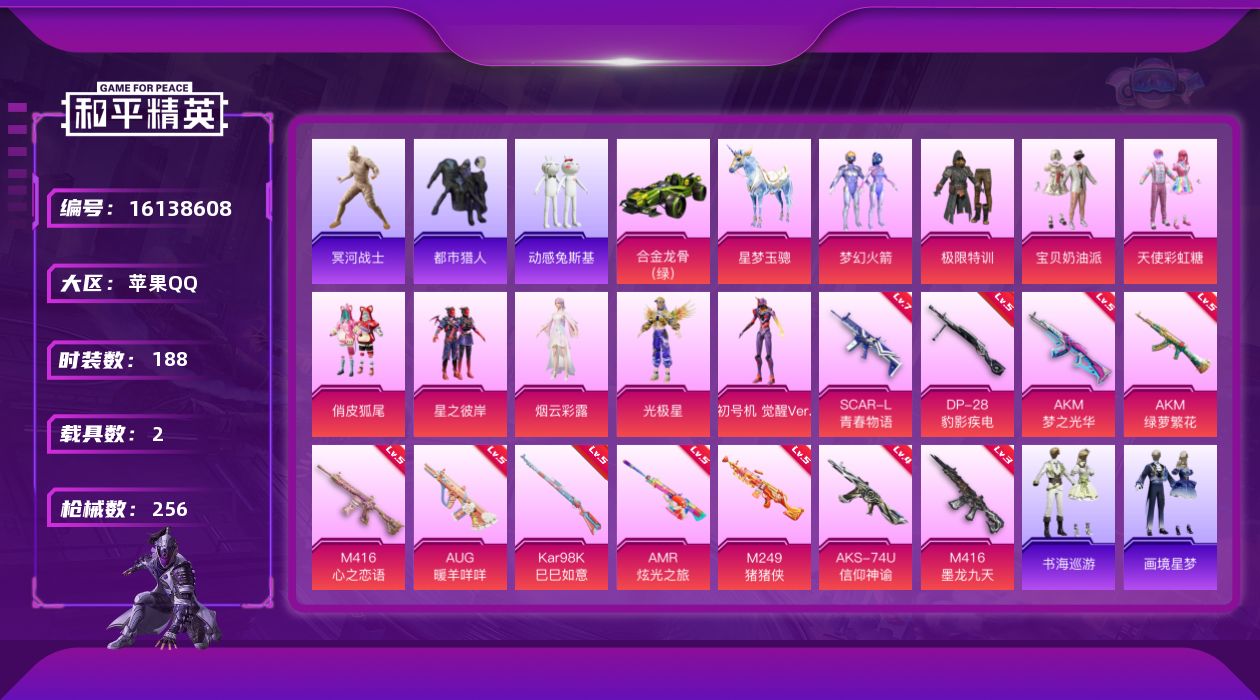 [16138608]【特价出售/店主推荐】苹果 手Q-9粉装-11特效枪-2载具-7粉色飞行器-85947热力值-19王牌印记-188套装-256枪皮