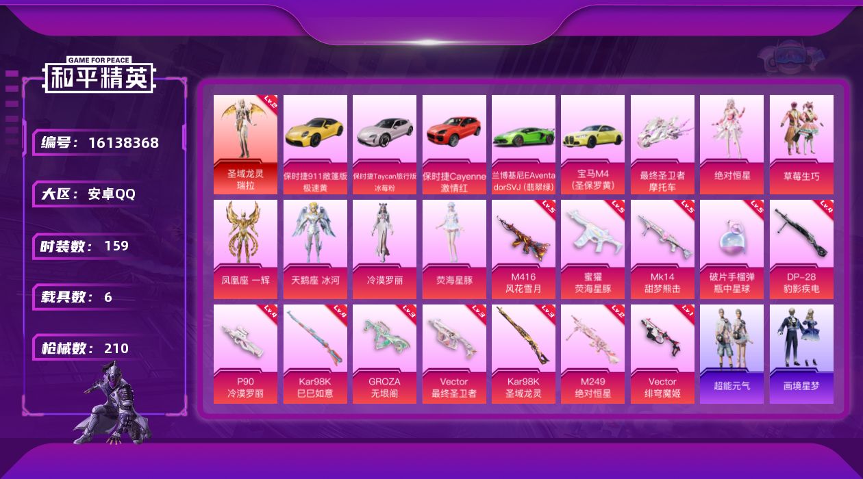 - [14232773]可二次【店主推荐捡漏号!可直接换绑】/素材身法号 安卓 手Q-1神装-3粉装-2特效枪-1载具-2粉色飞行器-2.4w热力值-4王牌印记-37套装-73枪皮【红色神装等级】:镜域双华-欧若拉(二级)【热门品类】:套装-龟仙人【粉色载具】:保时捷918 Spyder(液态银)【粉色套装】:角色-星云暗核,角色-紫钛骑兵,角色-异瞳寒姬【粉色枪皮等级】:Kar98K-巳巳如意(五级),DP-28-豹影疾电(五级)【粉色飞行器】:镜域双华-灵镜之阶