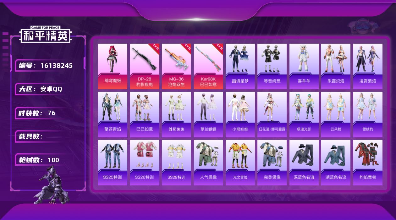 [16138245]【特价出售/店主推荐】 安卓 手Q-1粉装-3特效枪-0载具-1粉色飞行器-2.6w热力值-4王牌印记-76套装-100枪皮【粉色套装】:角色-绯穹魔姬【粉色枪皮等级】:Kar98K-巳巳如意(五级),DP-28-豹影疾电(五级),MG-36-沧焰双生(五级)【粉色枪皮】:Kar98K-巳巳如意,DP-28-豹影疾电,MG-36-沧焰双生