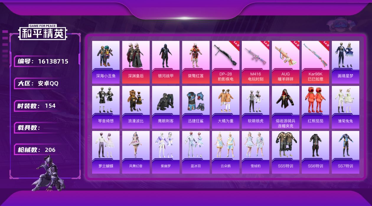 - [16944671]安卓 手Q-0粉装-4特效枪-0载具-1粉色飞行器-18863热力值-4王牌印记-45套装-89枪皮 【粉色枪皮等级】:AKS-74U-森灵之息(五级),Kar98K-巳巳如意(五级),DP-28-豹影疾电(五级) 【粉色枪皮】:AKS-74U-森灵之息,Kar98K-巳巳如意,Mk14-福马献瑞,DP-28-豹影疾电 【粉色飞行器】:炫彩糖果飞行器 【粉色降落伞】:炫彩糖果降落伞 【稀有套装】:套装-雪国风尚,套装-炫彩糖果,套装-粉恋花,套装-紫幽梦,套装-蓝冰羽,套装-云朵鹅,套装-雪绒豹,角色-灵公主,套装-朱霞炽焰,套装-凌霄紫焰 【稀有枪皮】:AUG-冰晶雪宝,AKM-影袭,AKM-破晓战魂,SCAR-L-夜灯,SCAR-L-玉兔迎春,SCAR-L-红色方程式,M416-红色方程式,M416-蓝色火焰,GROZA-影袭,AUG-耀粉歌者,M762-彩虹符号,M762-云朵鹅,ARX-凌霄紫焰,UZI-啾咪啾咪,UZI-天降萌叽,UZI-影袭,UZI-红色方程式,UMP45-夜灯,UMP45-蓝色火焰,汤姆逊-天降萌叽,JS9-凌霄紫焰,Kar98K-影袭,M24-影袭,Mini14-耀粉歌者,SVD-云朵鹅,S686-红色方程式,S1897-炫彩节奏,S12K-玩趣呆呆,S12K-夜灯,SPAS-12-云朵鹅,M249-彩虹符号,DP-28-彩虹符号,MG3-幻世战舞者,MG-36-凌霄紫焰,P92-凌霄紫焰,沙漠之鹰-云朵鹅,突击盾牌-绝对恒星,大砍刀-云朵鹅,撬棍-冷漠罗丽,平底锅-凌霄紫焰 【其他套装】:套装-冷焰舞者,套装-海岛探路者,套装-滨海厨神,套装-特战装甲,套装-特殊使命,套装-王牌教练,套装-白熊同盟,套装-竞技名士,套装-绮丽涂鸦,套装-绯格组合,套装-缤纷果语,套装-耀粉歌者,套装-蓝色运动,套装-长空猛禽,套装-青涩时光,套装-魅力单车,套装-黑色伏地魔,套装-鹰眼刺客,套装-冰冻风暴,套装-漫步者 【营地ID】:992562239
