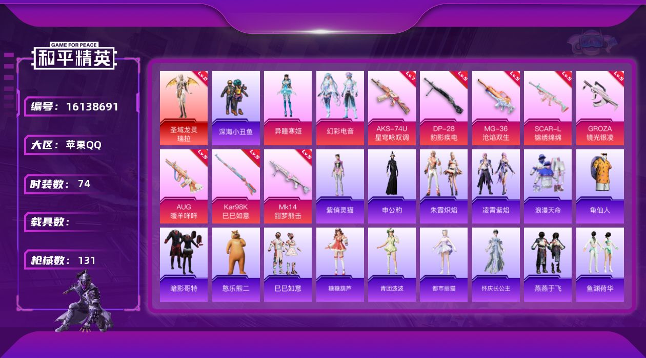 [16138691]【特价出售/店主推荐】苹果 手Q-1神装-2粉装-8特效枪-0载具-1粉色飞行器-36781热力值-1王牌印记-74套装-131枪皮 【红色神装等级】:圣域龙灵-瑞拉(二级) 【红色角色神装】:圣域龙灵-瑞拉 【热门品类】:套装-浪漫天命,套装-深海小丑鱼,套装-龟仙人,套装-暗影哥特 【粉色套装】:粉装-幻彩电音,角色-异瞳寒姬 【粉色枪皮等级】:SCAR-L-锦绣绵绵(五级),GROZA-镜光银凌(五级),AUG-暖羊咩咩(五级),AKS-74U-星穹咏叹调(七级),Kar98K-巳巳如意(五级),Mk14-甜梦熊击(五级),DP-28-豹影疾电(五级),MG-36-沧焰双生(五级) 【粉色枪皮】:SCAR-L-锦绣绵绵,GROZA-镜光银凌,AUG-暖羊咩咩,AKS-74U-星穹咏叹调,Kar98K-巳巳如意,Mk14-甜梦熊击,DP-28-豹影疾电,MG-36-沧焰双生 【粉色降落伞】:忍者神龟降落伞,临安公主降落伞,圣域龙灵降落伞,幻彩电音降落伞,异瞳寒姬降落伞,炫彩糖果降落伞 【稀有套装】:套装-龟仙人,玩偶服-憨乐熊二,套装-巳巳如意,套装-糖糖葫芦,套装-青团波波,角色-都市丽猫,角色-怀庆长公主,套装-燕燕于飞,套装-鱼渊荷华,套装-粉恋花,套装-紫幽梦,套装-蓝冰羽,角色-猎影月神,套装-云朵鹅,套装-雪绒豹,角色-乐音,套装-朱霞炽焰,套装-凌霄紫焰,角色-申公豹,角色-紫俏灵猫,套装-炫彩糖果 【稀有枪皮】:AUG-冰晶雪宝,AKM-江南烟雨,SCAR-L-夜灯,SCAR-L-冷漠罗丽,M416-萌萌史莱姆,GROZA-影袭,AUG-耀粉歌者,M762-彩虹符号,M762-云朵鹅,G36C-星穹咏叹调,蜜獾-天降萌叽,ARX-凌霄紫焰,UZI-天降萌叽,UZI-影袭,UMP45-夜灯,Vector-焰鹰斗篷,汤姆逊-智耀战神,JS9-凌霄紫焰,P90-巳巳如意,Kar98K-星穹咏叹调,M24-影袭,AWM-焰鹰斗篷,Mini14-穿刺龙虾,莫辛纳甘-蜜语绒猫,M200-六号稻草人,SVD-云朵鹅,S686-彩虹符号,S686-巳巳如意,S686-千金淑猫,S12K-玩趣呆呆,S12K-夜灯,S12K-智耀战神,S12K-极意拳锋,DBS-焰鹰斗篷,DBS-彩虹符号,SPAS-12-云朵鹅,M249-萌萌史莱姆,DP-28-焰鹰斗篷,MG3
