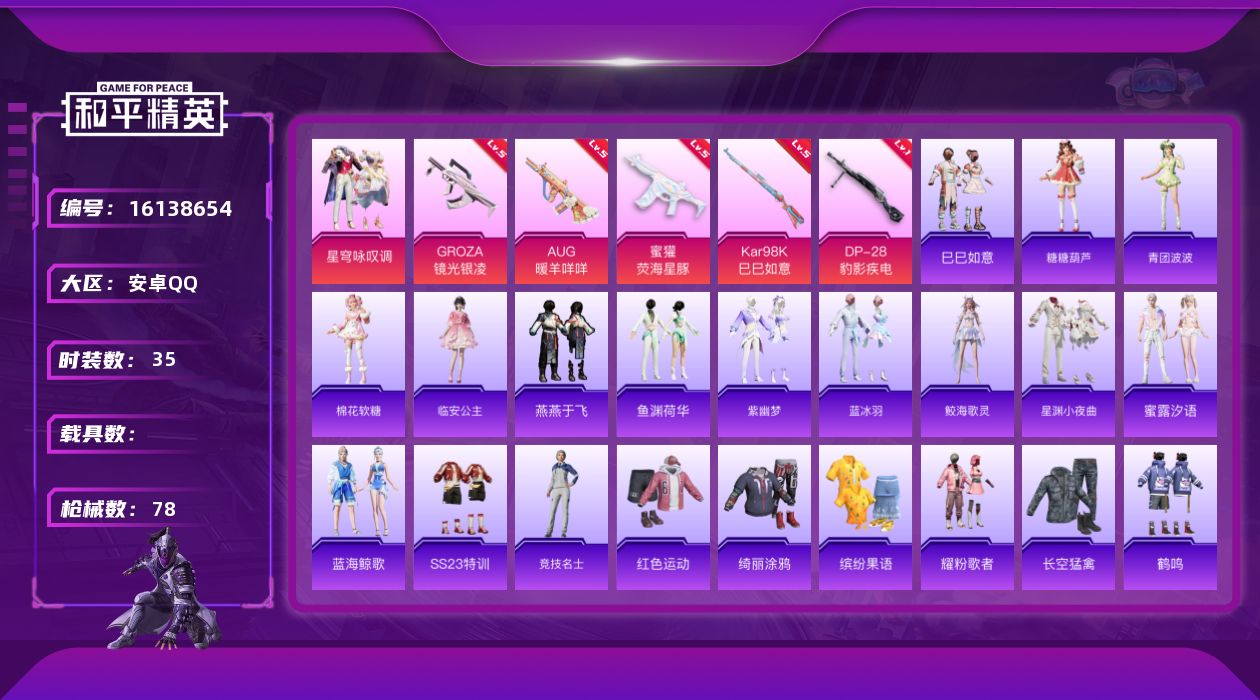 [16138654]【特价出售/店主推荐】安卓 手Q-1粉装-5特效枪-0载具-0粉色飞行器-20108热力值-2王牌印记-35套装-78枪皮 【粉色套装】:粉装-星穹咏叹调 【粉色枪皮等级】:GROZA-镜光银凌(五级),AUG-暖羊咩咩(五级),蜜獾-荧海星豚(五级),Kar98K-巳巳如意(五级),DP-28-豹影疾电(一级) 【粉色枪皮】:GROZA-镜光银凌,AUG-暖羊咩咩,蜜獾-荧海星豚,Kar98K-巳巳如意,DP-28-豹影疾电 【粉色降落伞】:雪梅暗香降落伞,纯梦嫁纱降落伞,时空协奏降落伞,英伦信使降落伞,千金淑猫降落伞,星穹咏叹调降落伞,荧海星豚降落伞 【稀有套装】:套装-巳巳如意,套装-糖糖葫芦,套装-青团波波,套装-棉花软糖,角色-临安公主,套装-燕燕于飞,套装-鱼渊荷华,套装-紫幽梦,套装-蓝冰羽,角色-鲛海歌灵,套装-星渊小夜曲,套装-蜜露汐语,套装-蓝海鲸歌 【稀有枪皮】:AKM-破晓战魂,M16A4-红色方程式,SCAR-L-炫彩节奏,M416-彩虹嘻嘻猴,M416-蓝色火焰,GROZA-荧海星豚,AUG-天降萌叽,AUG-耀粉歌者,QBZ-彩虹符号,M762-天降萌叽,Mk47-妙红点点,UMP45-仲夏莫吉托,UMP45-生命誓言,Vector-彩虹符号,汤姆逊-耀粉歌者,MP5K-彩虹嘻嘻猴,P90-飞驰魅影,P90-巳巳如意,Mini14-彩虹嘻嘻猴,Mini14-耀粉歌者,Mk14-治愈之星,AMR-妙红点点,M200-雪梅暗香,S686-巳巳如意,S1897-荧海星豚,S12K-玩趣呆呆,DBS-荧海星豚,M249-妙红点点,MG3-妙红点点,MG3-幻世战舞者,MG3-惊鸿侠骨,MG3-第五大道,大砍刀-雪梅暗香,大砍刀-黑金刀,破片手榴弹-巳巳如意 【其他套装】:套装-SS23特训,套装-竞技名士,套装-红色运动,套装-绮丽涂鸦,套装-缤纷果语,套装-耀粉歌者,套装-长空猛禽,套装-鹤鸣,套装-妙红点点,套装-幻彩翩翩,套装-银杏天影,套装-竹华凝韵 【营地ID】:950566175