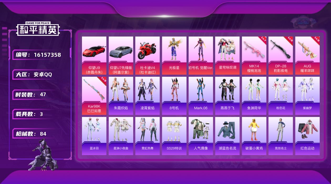[16157358]【特价出售/店主推荐】安卓 手Q-3粉装-4特效枪-3载具-0粉色飞行器-27142热力值-4王牌印记-47套装-84枪皮 【热门品类】:角色-8号机,角色-Mark.06 【粉色套装】:角色-光极星,角色-初号机 觉醒Ver.,粉装-星穹咏叹调 【粉色枪皮等级】:AUG-暖羊咩咩(五级),Kar98K-巳巳如意(五级),Mk14-樱桃泡泡(七级),DP-28-豹影疾电(五级) 【粉色载具】:仰望U9(赤霞丹朱),仰望U7(阿盖尔紫),杜卡迪 Panigale V4(杜卡迪红) 【粉色枪皮】:AUG-暖羊咩咩,Kar98K-巳巳如意,Mk14-樱桃泡泡,DP-28-豹影疾电 【粉色降落伞】:守护天翼降落伞,初号机 觉醒Ver.降落伞,鬼刀降落伞,圣域龙灵降落伞 【稀有套装】:套装-雪国风尚,套装-燕燕于飞,套装-鱼渊荷华,套装-粉恋花,套装-紫幽梦,套装-蓝冰羽,套装-星渊小夜曲,套装-霓虹热舞,套装-朱霞炽焰,套装-凌霄紫焰 【稀有枪皮】:AKM-破晓战魂,SCAR-L-夜灯,M416-红色方程式,M416-蓝色火焰,GROZA-恐龙拽拽,M762-彩虹符号,AC-VAL-六号稻草人,ARX-凌霄紫焰,UZI-月影灵韵,UMP45-夜灯,UMP45-极意拳锋,汤姆逊-炫彩节奏,AKS-74U-鬼刀,JS9-凌霄紫焰,P90-巳巳如意,SKS-炫彩节奏,MK20-H-樱桃泡泡,S686-生命誓言,S12K-夜灯,S12K-智耀战神,DBS-幻彩电音,DP-28-彩虹符号,MG-36-凌霄紫焰,P92-凌霄紫焰,短管霰弹-星穹咏叹调,平底锅-凌霄紫焰 【其他套装】:套装-SS29特训,套装-人气偶像,套装-湖蓝色名流,套装-破蛋小黄鸡,套装-竞技名士,套装-红色运动,套装-绮丽涂鸦,套装-缤纷果语,套装-蓝彩潮人,套装-超能勇士,套装-长空猛禽,套装-魅力单车,套装-纯真浪花,套装-热情海星,角色-8号机,角色-Mark.06,套装-粉日山川 【营地ID】:982273505