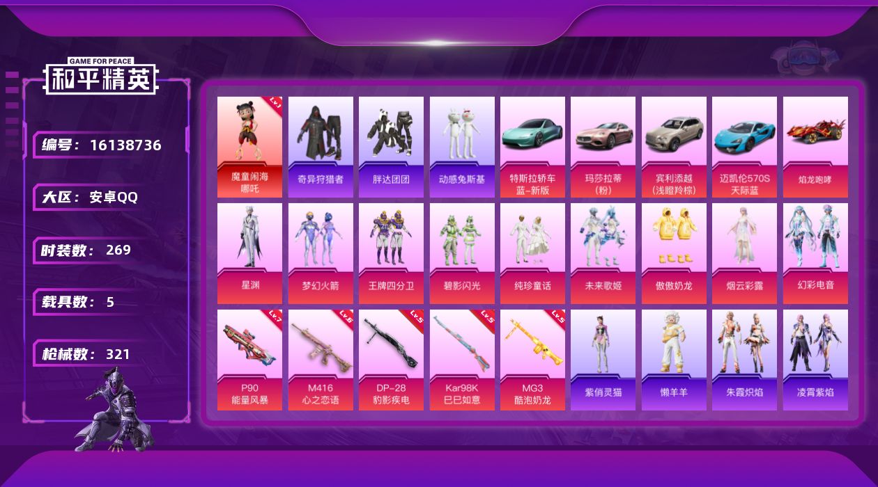 [16138736]连体王者v9安卓绝对防御上衣 手Q-1神装-9粉装-5特效枪-5载具-3粉色飞行器-107904热力值-19王牌印记-269套装-321枪皮