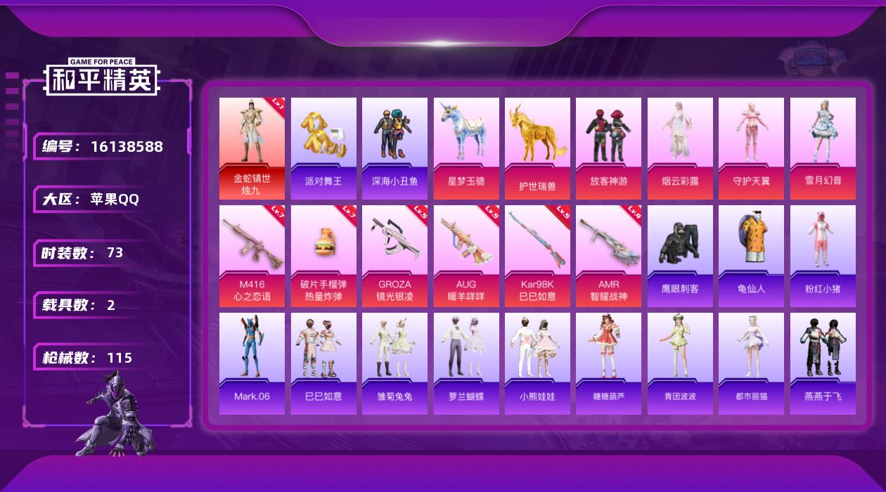 [16138588]【特价出售/店主推荐】苹果 手Q-1神装-4粉装-6特效枪-2载具-2粉色飞行器-37279热力值-4王牌印记-73套装-115枪皮