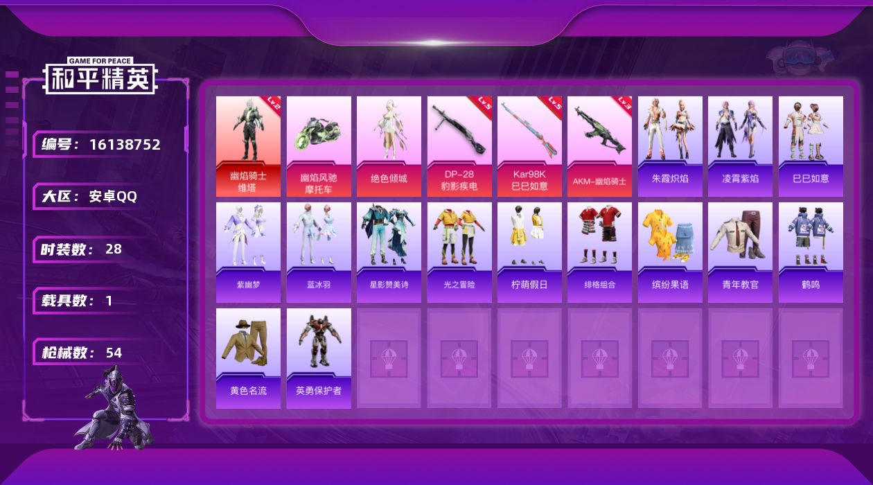 [16138752]【特价出售/店主推荐】安卓 手Q-1神装-1粉装-3特效枪-1载具-4粉色飞行器-19077热力值-4王牌印记-28套装-54枪皮 【红色神装等级】:幽焰骑士-维塔(二级) 【红色角色神装】:幽焰骑士-维塔 【粉色套装】:角色-绝色倾城 【粉色枪皮等级】:AKM-幽焰骑士(三级),Kar98K-巳巳如意(五级),DP-28-豹影疾电(五级) 【粉色载具】:幽焰风驰摩托车 【粉色枪皮】:AKM-幽焰骑士,Kar98K-巳巳如意,DP-28-豹影疾电 【粉色飞行器】:幽焰列车飞行器,圣域金龙飞行器,雀灵庇佑飞行器 【粉色降落伞】:繁龙极客降落伞,绝色倾城降落伞,幽焰骑士降落伞,圣域龙灵降落伞,辉羽雀灵降落伞,炫彩糖果降落伞 【稀有套装】:套装-巳巳如意,套装-紫幽梦,套装-蓝冰羽,套装-星影赞美诗,套装-朱霞炽焰,套装-凌霄紫焰 【稀有枪皮】:SCAR-L-炫彩节奏,SCAR-L-玉兔迎春,M416-蓝色火焰,M762-天降萌叽,ARX-凌霄紫焰,UZI-啾咪啾咪,UZI-天降萌叽,UMP45-繁龙极客,汤姆逊-智耀战神,AKS-74U-辉羽雀灵,JS9-凌霄紫焰,Mini14-辉羽雀灵,DP-28-彩虹符号,MG3-幻世战舞者,MG-36-凌霄紫焰,P92-凌霄紫焰,平底锅-绝色倾城,平底锅-凌霄紫焰 【其他套装】:套装-光之冒险,套装-柠萌假日,套装-绯格组合,套装-缤纷果语,套装-青年教官,套装-鹤鸣,套装-黄色名流,角色-英勇保护者 【营地ID】:1003507080