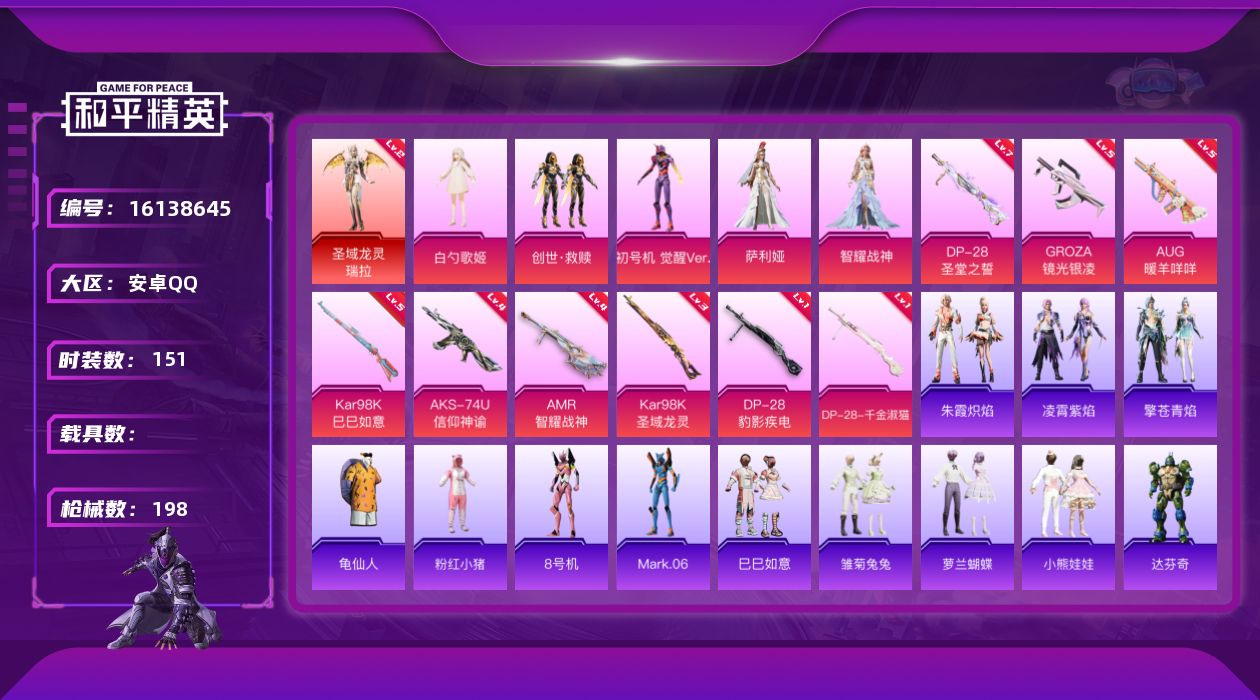 [16138645]安卓 手Q-1神装-5粉装-9特效枪-0载具-2粉色飞行器-59264热力值-9王牌印记-151套装-198枪皮