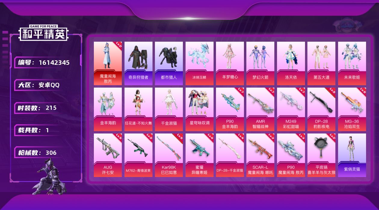 [16142345]安卓 手Q-1神装-9粉装-13特效枪-1载具-6粉色飞行器-98525热力值-17王牌印记-215套装-306枪皮