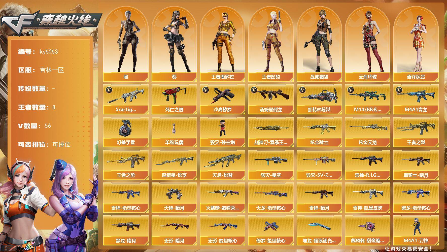 [16164546]吉林一区-56V-8王者-2炫金 【热门武器】:M14EBR-玄武,Scar Light-白虎,M4A1-青龙,死亡之眼,汤姆逊-烈龙,加特林-炼狱*2,羊驼玩偶,毁灭-孙三炮,沙鹰-修罗*4,高爆手雷-幻兽 【王者炫金武器】:王者之戮,超新星-悦享,天启-悦智,王者之势,斩神刀-雷暴王者,炫金骑士,炫金天龙 【皮肤】:雷神-暗月,雷神-能量核心,雷神-R.LGD-CFPLS18冠军,雷神-航星皮肤,火麒麟-巅峰荣耀,毁灭-星空,毁灭-SV-CFPLS16冠军,黑龙-能量核心*2,黑龙-暗月,黑骑士-暗月,无影-暗月,无影-能量核心,天龙-能量核心,修罗-能量核心*2,天神-暗月*2,屠龙-破浪逐光 皮肤,麒麟刺-甜蜜糖果 皮肤 【角色】:葵,瞳,战地猎狐,王者影豹,王者潘多拉,奇洋探员,云海玲珑,风暴女,娟娟,麻雀,潘多拉-甜心教官 【人偶武器】:毁灭-孙三炮,星神-炽天使,M4A1-刀锋,迷你牛牛,新QBZ03-精英斯沃特 【暴走生化】:死亡之眼 【英雄级武器】:AK47-火麒麟,M4A1-黑龙,M4A1-雷神,AK47-无影,AK47-黑武士,M4A1-武圣,AK47-机械迷城,AK47-黑鲨,M4A1-青龙,Scar Light-白虎,M14EBR-玄武,M4A1-玫瑰精灵,M4A1-猎神,王者之烈-觉醒版,王者芳薇-觉醒版,AWM-天龙,Barrett-毁灭,AWM-裁决,王者风神-觉醒版,加特林-炼狱*2,汤姆逊-烈龙,AA-12-雷霆,沙鹰-修罗*4,沙鹰-天神,COP 357-云龙,沙鹰-幻兽,Glock18-武圣,屠龙*2,龙啸,擎天,麒麟刺*3,幻灵之锋,女皇利刃-幻兽,高爆手雷-幻兽,高爆手雷-云龙,闪光弹-雷霆,闪光弹-幻兽,闪光弹-雷暴,闪光弹-幻灵,闪光弹-竞技荣光*4,闪光弹-云龙,烟雾弹-幻兽,烟雾弹-幻灵,烟雾弹-竞技荣光*2,烟雾弹-云龙 【道具】:CFS限定背包,亚洲杯纪念炫彩背包,战舰背包,炫彩背包,超级背包,救世主-黑桃战神,绿色巨人,灵魂忍者,迷雾幽灵,夺命之镰,防化服*2,金色流光-枪王排位,星辰流光-枪王排位,流光-再燃火线,枪王排位28赛季金色流光,EP战队收纳包,EP战队名片,EP战队喷图,EP战队击杀图标,C4-红龙,防弹头盔*4,防弹衣*5,C4工具钳*4,手雷包*5 【特殊枪械】:1白虎,1烈龙,2炼狱