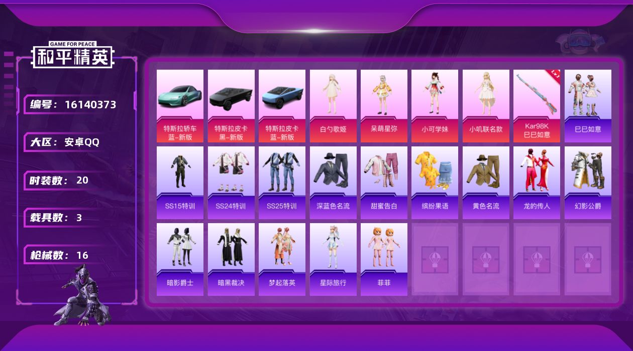 [16140373]【特价出售/店主推荐】安卓 手Q-4粉装-1特效枪-3载具-1w热力值-2王牌印记-20套装-16枪皮 【粉色套装】:角色-白勺歌姬,角色-呆萌星弥,角色-小可学妹,角色-小叽联名款 【粉色枪皮等级】:Kar98K-巳巳如意(一级) 【粉色载具】:特斯拉Roadster(水滴蓝),特斯拉Cybertruck(极昼黑),特斯拉Cybertruck(荒芜蓝) 【粉色枪皮】:Kar98K-巳巳如意 【粉色降落伞】:暗翼战神降落伞,飒粉甜心降落伞,白勺歌姬降落伞,小叽联名款降落伞 【稀有套装】:套装-巳巳如意 【稀有枪皮】:AUG-天降萌叽,QBZ-暗翼战神,AC-VAL-天降萌叽,MP5K-飒粉甜心,Kar98K-彩虹符号,AMR-白勺歌姬,S686-生命誓言,S686-白勺歌姬,DP-28-彩虹符号 【其他套装】:套装-SS15特训,套装-SS24特训,套装-SS25特训,套装-深蓝色名流,套装-甜蜜告白,套装-缤纷果语,套装-黄色名流,套装-龙的传人,套装-幻影公爵,套装-暗影爵士,套装-暗黑裁决,套装-梦起落英,角色-星际旅行,玩偶服-菲菲 【营地ID】:942665323