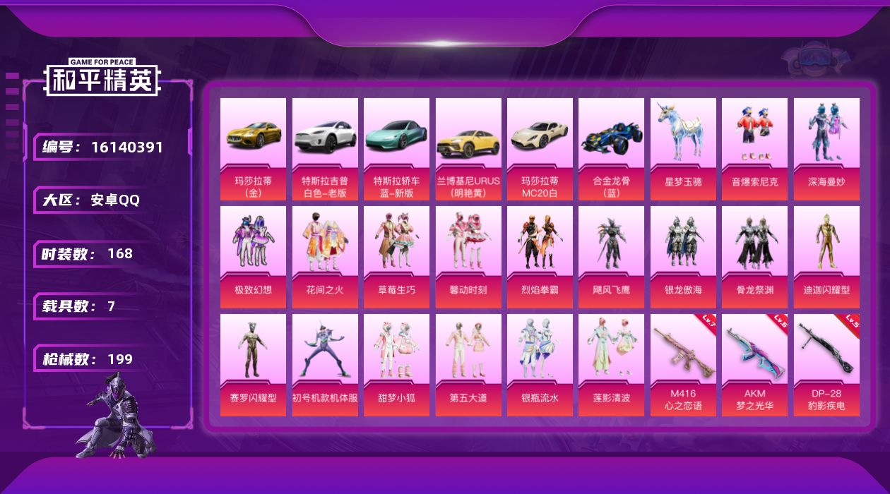 [16140391]【店主推荐捡漏号!可直接换绑】安卓 手Q-17粉装-13特效枪-7载具-6粉色飞行器-8.3w热力值-13王牌印记-168套装-199枪皮 【热门品类】:粉装-音爆索尼克,套装-金羽特工,套装-星河浪客,套装-暗夜行者,套装-龟仙人,套装-暗影哥特,套装-粉红小猪,套装-红熊茄茄 【粉色套装】:粉装-深海曼妙,粉装-极致幻想,粉装-花间之火,粉装-草莓生巧,粉装-馨动时刻,粉装-烈焰拳霸,粉装-飓风飞鹰,粉装-银龙傲海,粉装-骨龙祭渊,角色-闪耀迪迦,角色-赛罗闪耀型,角色-初号机款机体服,粉装-甜梦小狐,粉装-音爆索尼克,粉装-第五大道,粉装-银瓶流水,粉装-莲影清波 【粉色枪皮等级】:AKM-梦之光华(六级),AKM-绿萝繁花(五级),SCAR-L-机甲封神(五级),SCAR-L-锦绣绵绵(五级),M416-心之恋语(七级),AUG-星梦奇缘(五级),UMP45-雪国精灵(五级),Kar98K-创世·救赎(一级),Kar98K-巳巳如意(五级),VSS-烈焰拳霸(四级),SPAS-12-音爆索尼克(四级),DP-28-千金淑猫(一级),DP-28-豹影疾电(五级) 【粉色载具】:特斯拉Model X(珍珠白),特斯拉Roadster(水滴蓝),兰博基尼URUS(明艳黄),玛莎拉蒂MC20(星石白),玛莎拉蒂Ghibli(金),合金龙骨(蓝),星梦玉骢 【粉色枪皮】:AKM-梦之光华,AKM-绿萝繁花,SCAR-L-机甲封神,SCAR-L-锦绣绵绵,M416-心之恋语,AUG-星梦奇缘,UMP45-雪国精灵,Kar98K-创世·救赎,Kar98K-巳巳如意,VSS-烈焰拳霸,SPAS-12-音爆索尼克,DP-28-千金淑猫,DP-28-豹影疾电 【粉色飞行器】:深海曼妙飞行器,心之恋语飞行翼,夏日绵绵冰飞行器,梦之光华飞行器,萌物绒绒飞行器,星梦奇缘飞行器 【粉色降落伞】:深海曼妙降落伞,粉色回忆降落伞,花间之火降落伞,夏日绵绵冰降落伞,梦之光华降落伞,烈焰拳霸降落伞,暗夜玫瑰降落伞,音爆索尼克降落伞,仲夏莫吉托降落伞,炫光之旅降落伞,星梦奇缘降落伞,千金淑猫降落伞,喜羊羊与灰太狼降落伞 【稀有套装】:套装-龟仙人,套装-巳巳如意,角色-都市丽猫,角色-摩登魅猫,套装-新风雅兰,套装-霓虹热舞,套装-朱霞炽焰,套装-凌霄紫焰,套装-擎苍青焰,角色-敖闰 【稀有枪