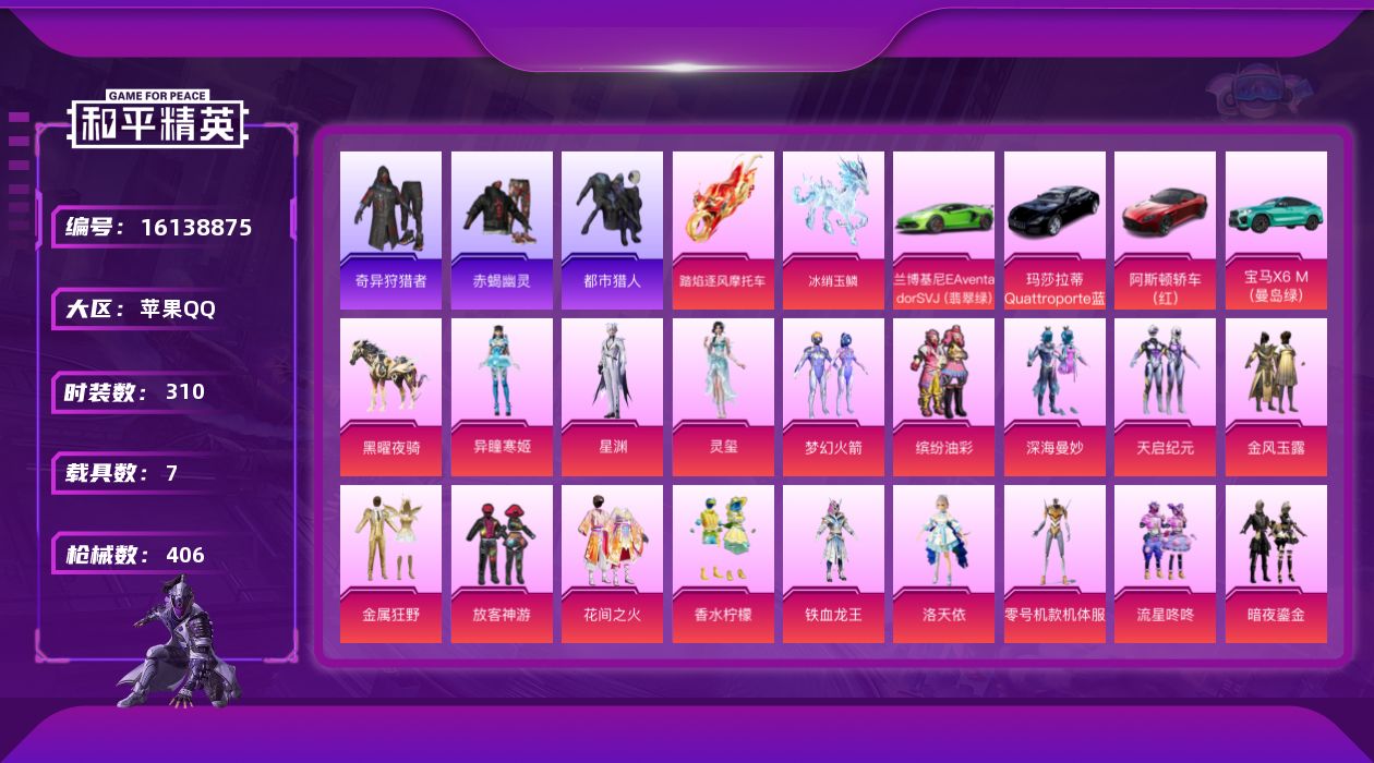 [16138875]【特价出售/店主推荐】苹果 手Q-26粉装-18特效枪-7载具-1僚机-9粉色飞行器-145058热力值-23王牌印记-310套装-406枪皮【热门品类】:粉装-梦幻火箭,粉装-缤纷油彩,套装-赤蝎幽灵,套装-都市猎人,套装-奇异狩猎者,套装-金羽特工,角色-2P战斗服款,套装-SS1特训,套装-龟仙人,套装-红熊茄【粉色套装】:粉装-深海曼妙,粉装-梦幻火箭,粉装-天启纪元,粉装-金风玉露,粉装-金属狂野,粉装-缤纷油彩,粉装-放客神游,粉装-花间之火,粉装-香水柠檬,粉装-铁血龙王,角色-洛天依,角色-零号机款机体服,粉装-流星咚咚,粉装-暗夜鎏金,粉装-炫光之旅,角色-宙之时溯,角色-星云暗核,角色-紫钛骑兵,角色-守护天翼,粉装-幻彩电音,角色-罗征,角色-奇迹舞步 美琪,角色-奇迹舞步 美雪,角色-星渊,角色-灵玺,角色-异瞳寒姬【粉色枪皮等级】:AKM-炫紫旋律(五级),SCAR-L-机甲封神(五级),SCAR-L-魔童闹海 哪吒(三级),M416-心之恋语(六级),GROZA-焦糖拿铁(五级),UMP45-相思残雪(五级),Vector-绯穹魔姬(四级),野牛-流星咚咚(五级),AKS-74U-无垠阁(三级),P90-仙履奇缘(五级),P90-魔童闹海 敖丙(三级),Kar98K-巳巳如意(五级),AWM-花间之火(四级),M417-第五大道(四级),SPAS-12-音爆索尼克(四级),DP-28-豹影疾电(五级),MG3-洛神天依(五级),平底锅-喜羊羊与灰太狼(二级)【粉色载具】:兰博基尼Aventador SVJ(翡翠绿),阿斯顿马丁DBS(红),玛莎拉蒂Quattroporte(夜幕蓝),宝马X6 M(曼岛绿),踏焰逐风摩托车,僚机-冰龙团团,黑曜夜骑,冰绡玉鳞【粉色枪皮】:AKM-炫紫旋律,SCAR-L-机甲封神,SCAR-L-魔童闹海 哪吒,M416-心之恋语,GROZA-焦糖拿铁,UMP45-相思残雪,Vector-绯穹魔姬,野牛-流星咚咚,AKS-74U-无垠阁,P90-仙履奇缘,P90-魔童闹海 敖丙,Kar98K-巳巳如意,AWM-花间之火,M417-第五大道,SPAS-12-音爆索尼克,DP-28-豹影疾电,MG3-洛神天依,平底锅-喜羊羊与灰太狼【粉色飞行器】:深海曼妙飞行器,炫紫旋律飞行器,心之恋语飞行翼,霓虹漫游飞行器,终