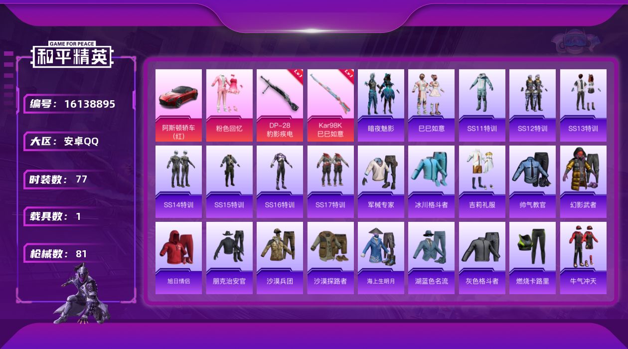 [16138895]【特价出售/店主推荐】安卓 手Q-1粉装-2特效枪-1载具-1粉色飞行器-25884热力值-2王牌印记-77套装-81枪皮