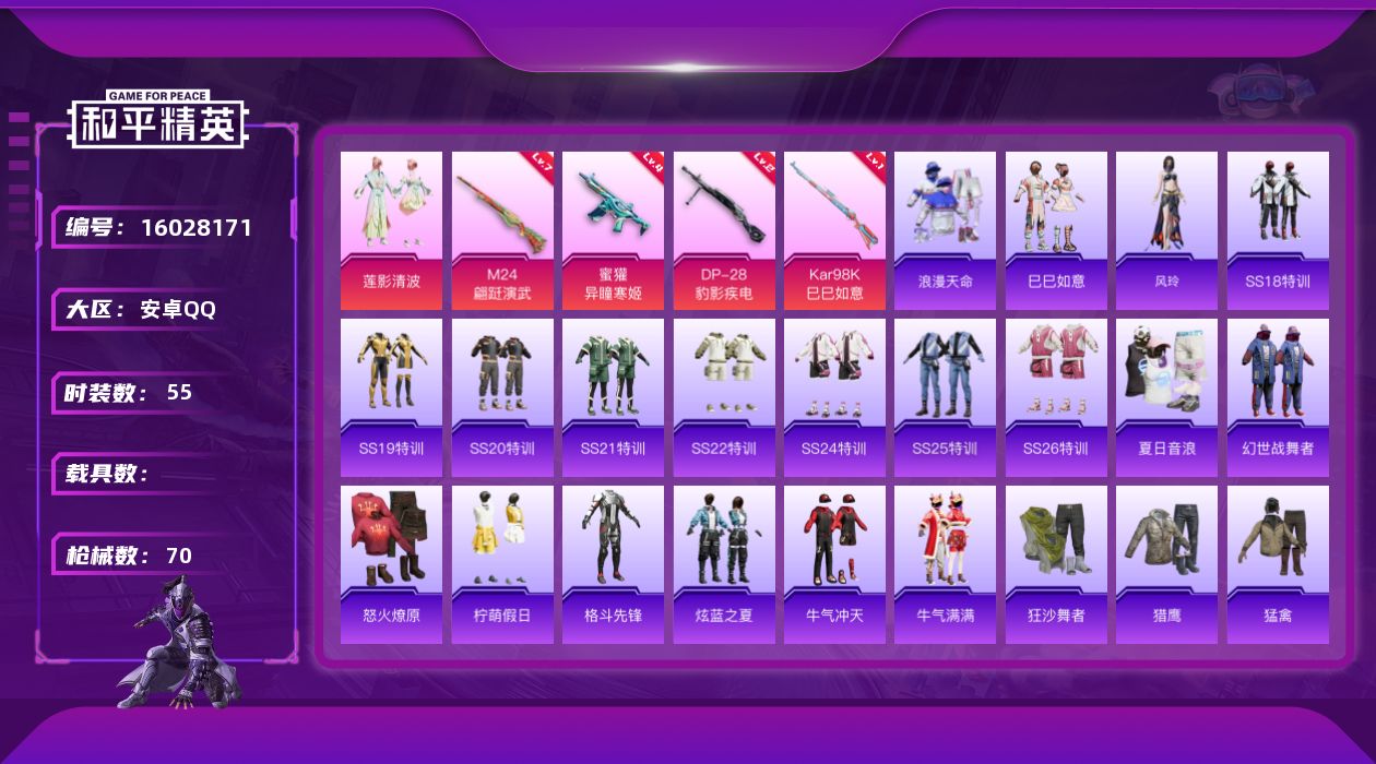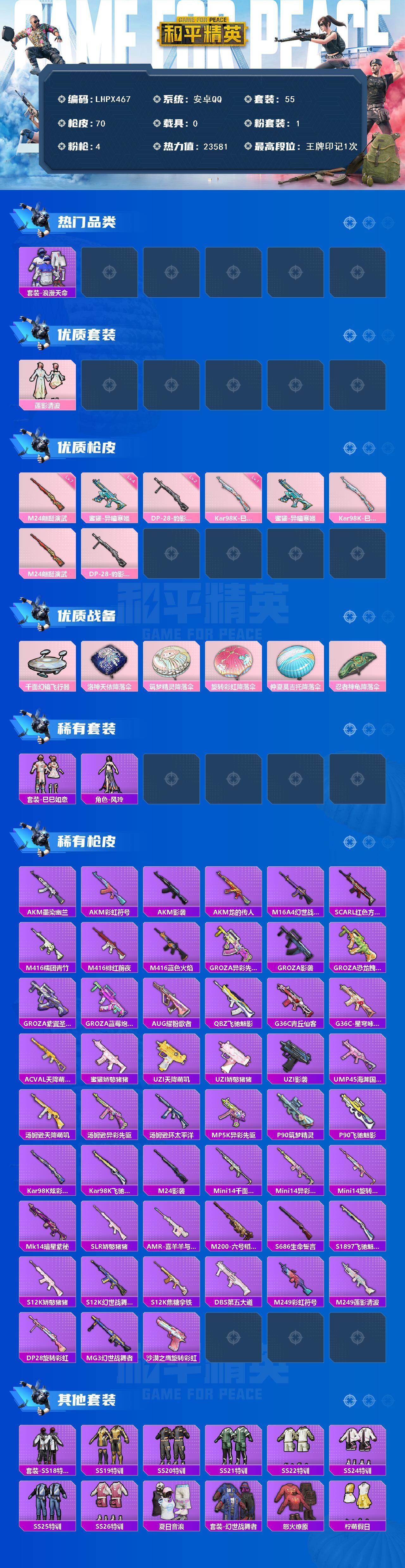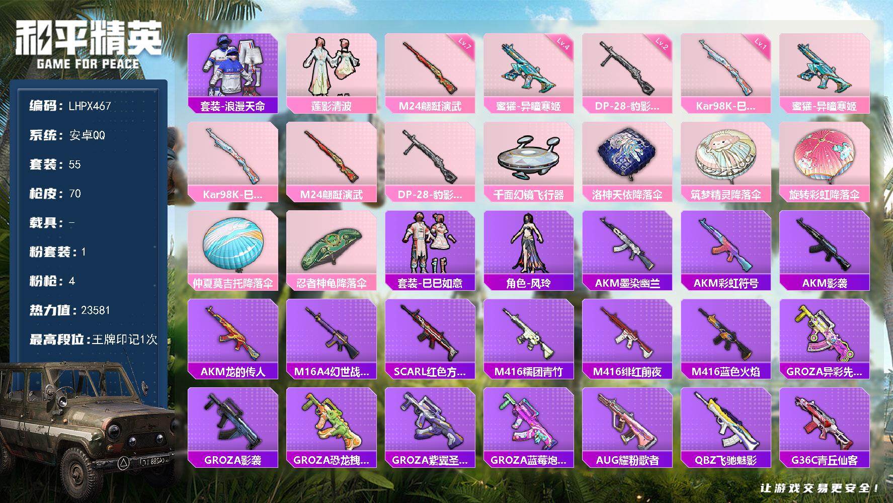 [16028171]【店主推荐捡漏号!可直接换绑】安卓 手Q-1粉装-4特效枪-0载具-1粉色飞行器-23581热力值-1王牌印记-55套装-70枪皮 【热门品类】:套装-浪漫天命 【粉色套装】:粉装-莲影清波 【粉色枪皮等级】:蜜獾-异瞳寒姬(四级),Kar98K-巳巳如意(一级),M24-翩跹演武(七级),DP-28-豹影疾电(二级) 【粉色枪皮】:蜜獾-异瞳寒姬,Kar98K-巳巳如意,M24-翩跹演武,DP-28-豹影疾电 【粉色飞行器】:千面幻镜飞行器 【粉色降落伞】:洛神天依降落伞,筑梦精灵降落伞,旋转彩虹降落伞,仲夏莫吉托降落伞,忍者神龟降落伞 【稀有套装】:套装-巳巳如意,角色-风玲 【稀有枪皮】:AKM-墨染幽兰,AKM-彩虹符号,AKM-影袭,AKM-龙的传人,M16A4-幻世战舞者,SCAR-L-红色方程式,M416-糯团青竹,M416-绯红前夜,M416-蓝色火焰,GROZA-异彩先驱,GROZA-影袭,GROZA-恐龙拽拽,GROZA-紫翼圣骑,GROZA-蓝莓炮弹,AUG-耀粉歌者,QBZ-飞驰魅影,G36C-青丘仙客,G36C-星穹咏叹调,AC-VAL-天降萌叽,蜜獾-娇憨猪猪,UZI-天降萌叽,UZI-娇憨猪猪,UZI-影袭,UMP45-海渊国主,汤姆逊-天降萌叽,汤姆逊-异彩先驱,汤姆逊-环太平洋,MP5K-异彩先驱,P90-筑梦精灵,P90-飞驰魅影,Kar98K-炫彩节奏,Kar98K-飞驰魅影,M24-影袭,Mini14-千面幻镜,Mini14-异彩先驱,Mini14-旋转彩虹,Mk14-暗星紫秘,SLR-娇憨猪猪,AMR-喜羊羊与灰太狼,M200-六号稻草人,S686-生命誓言,S1897-飞驰魅影,S12K-娇憨猪猪,S12K-幻世战舞者,S12K-焦糖拿铁,DBS-第五大道,M249-彩虹符号,M249-莲影清波,DP-28-旋转彩虹,MG3-幻世战舞者,沙漠之鹰-旋转彩虹 【其他套装】:套装-SS18特训,套装-SS19特训,套装-SS20特训,套装-SS21特训,套装-SS22特训,套装-SS24特训,套装-SS25特训,套装-SS26特训,套装-夏日音浪,套装-幻世战舞者,套装-怒火燎原,套装-柠萌假日,套装-格斗先锋,套装-浪漫天命,套装-炫蓝之夏,套装-牛气冲天,套装-牛气满满,套装-狂沙舞者,套装-猎鹰,套装-猛禽,套装-玉兔