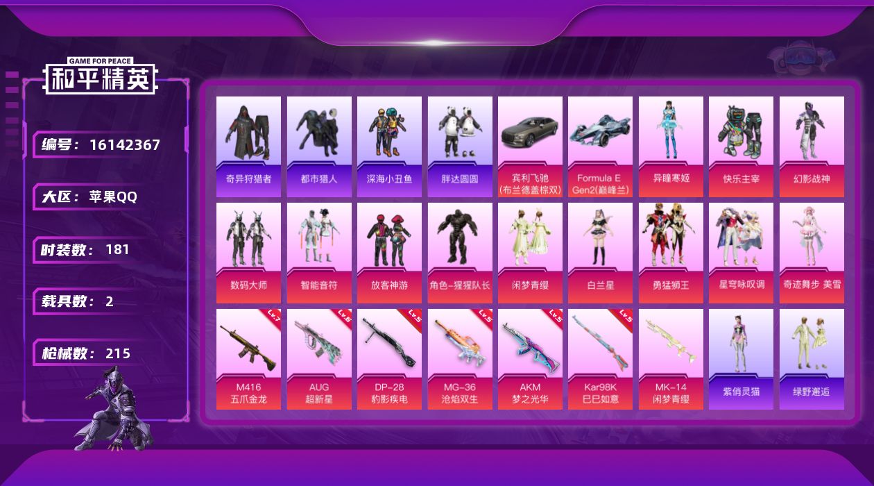 [16142367]【店主推荐捡漏号!可直接换绑】苹果 手Q-13粉装-7特效枪-2载具-1粉色飞行器-7w热力值-16王牌印记-181套装-215枪皮 【热门品类】:套装-浪漫天命,套装-都市猎人,套装-深海小丑鱼,套装-奇异狩猎者,角色-军刀雅典娜,套装-胖达圆圆,套装-忍者信条,套装-龟仙人 【粉色套装】:粉装-快乐主宰,粉装-幻影战神,粉装-数码大师,粉装-智能音符,粉装-放客神游,粉装-绿野邂逅,角色-猩猩队长,粉装-闲梦青缨,角色-白兰星,粉装-勇猛狮王,粉装-星穹咏叹调,角色-奇迹舞步 美雪,角色-异瞳寒姬 【粉色枪皮等级】:AKM-梦之光华(五级),M416-五爪金龙(七级),AUG-超新星(六级),Kar98K-巳巳如意(五级),DP-28-豹影疾电(五级),MG-36-沧焰双生(五级) 【粉色载具】:宾利飞驰(布罗德盖棕双色),Formula E Gen2(巅峰兰) 【粉色枪皮】:AKM-梦之光华,M416-五爪金龙,AUG-超新星,Kar98K-巳巳如意,Mk14-闲梦青缨,DP-28-豹影疾电,MG-36-沧焰双生 【粉色飞行器】:梦幻火箭飞行器 【粉色降落伞】:幻影战神降落伞,百万伏特降落伞,至尊龙雀降落伞,春暖花开降落伞,恐龙拽拽降落伞,环太平洋降落伞,星际浪客降落伞,青空秋雨降落伞,暗夜鎏金降落伞,飒粉甜心降落伞,未来歌姬降落伞,闲梦青缨降落伞,莲影清波降落伞,异瞳寒姬降落伞,炫彩糖果降落伞 【稀有套装】:套装-龟仙人,套装-巳巳如意,角色-摩登魅猫,套装-彩虹兔,套装-云朵鹅,套装-雪绒豹,角色-灵公主,角色-绛羽幽主,角色-夜瞳黯灵,套装-朱霞炽焰,套装-凌霄紫焰,套装-擎苍青焰,角色-紫俏灵猫 【稀有枪皮】:AKM-影袭,AKM-环太平洋,AKM-百万伏特,AKM-缤纷海域,AKM-龙的传人,M16A4-甜心亚梦,M16A4-千金淑猫,SCAR-L-夜灯,SCAR-L-炫彩节奏,SCAR-L-玉兔迎春,SCAR-L-黄金龙骨,M416-糯团青竹,M416-绯红前夜,M416-蓝色火焰,GROZA-彩虹符号,GROZA-影袭,GROZA-懵萌河马,GROZA-田园牧歌,AUG-幻影战神,AUG-耀粉歌者,AUG-闲梦青缨,QBZ-洛神天依,M762-天降萌叽,M762-奇异狩猎者,M762-第五大道,M762-云朵鹅,Mk47-妙红点点,Mk47-洛