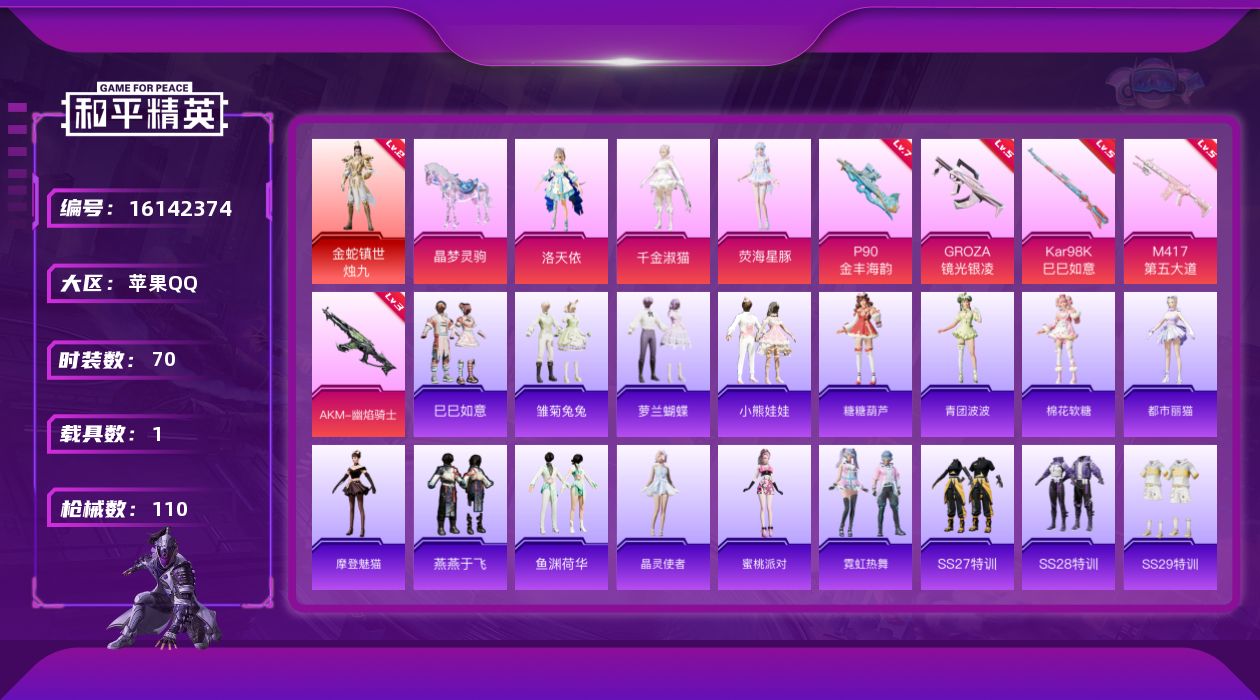 [16142374]【店主推荐捡漏号!可直接换绑】苹果 手Q-1神装-3粉装-5特效枪-1载具-3粉色飞行器-35996热力值-9王牌印记-70套装-110枪皮