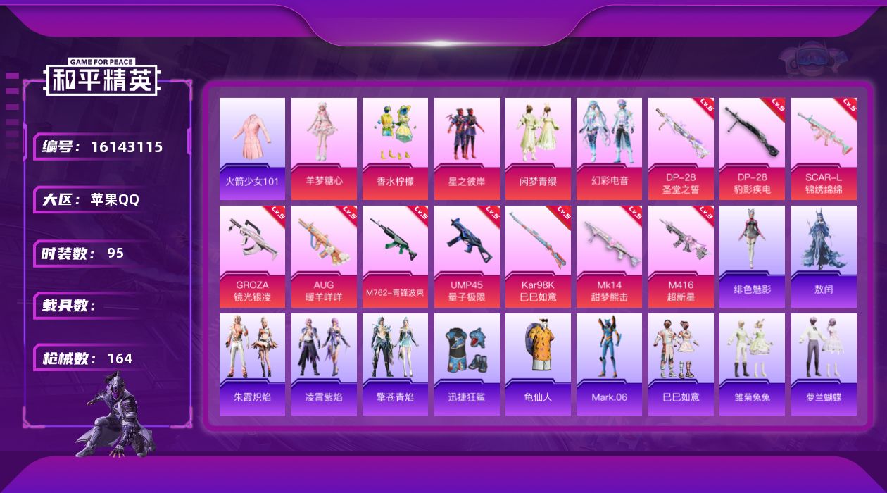 [16143115]老101【店主推荐捡漏号!可直接换绑】苹果 手Q-5粉装-10特效枪-0载具-0粉色飞行器-51602热力值-10王牌印记-95套装-164枪皮【热门品类】:套装-火箭少女101,套装-龟仙人,角色-Mark.06【粉色套装】:粉装-香水柠檬,粉装-星之彼岸,粉装-闲梦青缨,粉装-幻彩电音,角色-羊梦糖心【粉色枪皮等级】:SCAR-L-锦绣绵绵(五级),M416-超新星(三级),GROZA-镜光银凌(五级),AUG-暖羊咩咩(五级),M762-青锋波束(五级),UMP45-量子极限(五级),Kar98K-巳巳如意(五级),Mk14-甜梦熊击(五级),DP-28-圣堂之誓(六级),DP-28-豹影疾电(五级)【粉色枪皮】:SCAR-L-锦绣绵绵,M416-超新星,GROZA-镜光银凌,AUG-暖羊咩咩,M762-青锋波束,UMP45-量子极限,Kar98K-巳巳如意,Mk14-甜梦熊击,DP-28-圣堂之誓,DP-28-豹影疾电