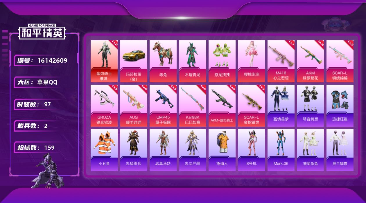 [16142609]【特价出售/店主推荐】苹果 手Q-1神装-3粉装-9特效枪-2载具-4粉色飞行器-5.2w热力值-7王牌印记-97套装-159枪皮