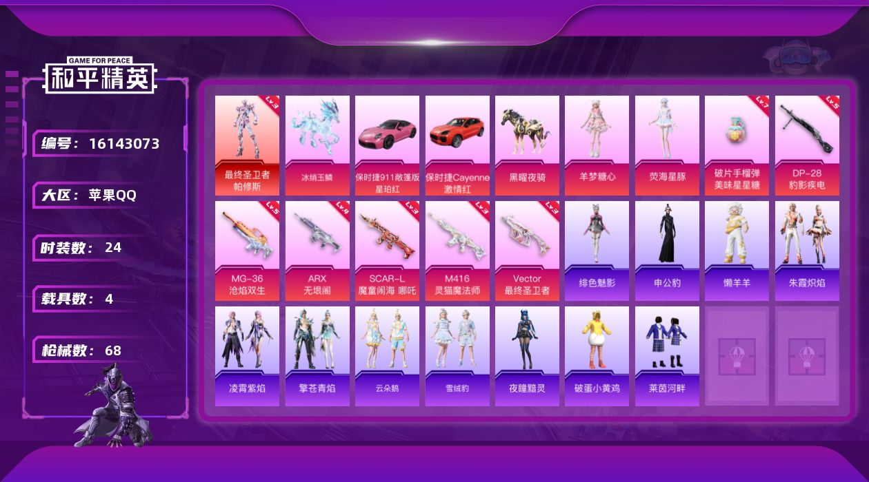 [16143073]【店主推荐捡漏号!可直接换绑】苹果 手Q-1神装-2粉装-7特效枪-4载具-5粉色飞行器-28934热力值-3王牌印记-24套装-68枪皮【红色神装等级】:最终圣卫者-帕修斯(三级)【红色角色神装】:最终圣卫者-帕修斯【粉色套装】:角色-荧海星豚,角色-羊梦糖心【粉色枪皮等级】:SCAR-L-魔童闹海 哪吒(三级),M416-灵猫魔法师(三级),ARX-无垠阁(四级),Vector-最终圣卫者(三级),DP-28-豹影疾电(五级),MG-36-沧焰双生(五级),破片手榴弹-美味星星糖(七级)【粉色载具】:保时捷911 敞篷版(星珀红),保时捷Cayenne(激情红),黑曜夜骑,冰绡玉鳞【粉色枪皮】:SCAR-L-魔童闹海 哪吒,M416-灵猫魔法师,ARX-无垠阁,Vector-最终圣卫者,DP-28-豹影疾电,MG-36-沧焰双生,破片手榴弹-美味星星糖