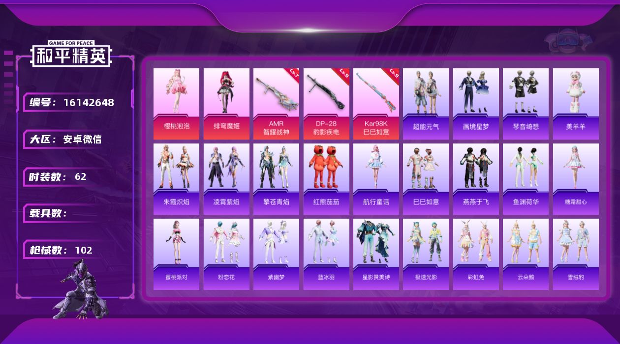 [16142648]【特价出售/店主推荐】安卓 微信-无敌战神框-2粉装-3特效枪-1粉色飞行器-2.7w热力值-7王牌印记-62套装-102枪皮 【热门品类】:套装-红熊茄茄 【粉色套装】:角色-樱桃泡泡,角色-绯穹魔姬 【粉色枪皮等级】:Kar98K-巳巳如意(五级),AMR-智耀战神(七级),DP-28-豹影疾电(五级) 【粉色枪皮】:Kar98K-巳巳如意,AMR-智耀战神,DP-28-豹影疾电 【粉色降落伞】:繁龙极客降落伞,樱桃泡泡降落伞,幻彩电音降落伞,喜羊羊与灰太狼降落伞,炫彩糖果降落伞 【稀有套装】:套装-航行童话,套装-巳巳如意,套装-超能元气,套装-雪国风尚,套装-燕燕于飞,套装-鱼渊荷华,角色-糖霜甜心,角色-蜜桃派对,套装-粉恋花,套装-紫幽梦,套装-蓝冰羽,套装-星影赞美诗,套装-极速光影,套装-彩虹兔,套装-云朵鹅,套装-雪绒豹,角色-绛羽幽主,套装-朱霞炽焰,套装-凌霄紫焰,套装-擎苍青焰,玩偶服-美羊羊,套装-画境星梦,套装-琴音绮想,套装-炫彩糖果 【稀有枪皮】:AUG-冰晶雪宝,M16A4-幻世战舞者,SCAR-L-玉兔迎春,M416-蓝色火焰,AUG-耀粉歌者,M762-天降萌叽,M762-云朵鹅,AC-VAL-六号稻草人,蜜獾-绯穹魔姬,ACE32-画境星梦,ARX-凌霄紫焰,UZI-啾咪啾咪,UZI-天降萌叽,Vector-生命誓言,汤姆逊-耀粉歌者,汤姆逊-樱桃泡泡,汤姆逊-智耀战神,MP5K-画境星梦,JS9-凌霄紫焰,P90-巳巳如意,M24-樱桃泡泡,MK20-H-樱桃泡泡,SVD-云朵鹅,M1加兰德-画境星梦,S686-生命誓言,S686-巳巳如意,S12K-智耀战神,AA12-G-画境星梦,SPAS-12-云朵鹅,M249-绯穹魔姬,MG3-幻世战舞者,MG3-智耀战神,MG-36-凌霄紫焰,P92-凌霄紫焰,R45-幻彩电音,短管霰弹-星穹咏叹调,沙漠之鹰-云朵鹅,爆炸猎弓-喜羊羊与灰太狼,突击盾牌-绝对恒星,大砍刀-云朵鹅,大砍刀-黑金刀,平底锅-凌霄紫焰,平底锅-画境星梦,破片手榴弹-巳巳如意 【其他套装】:套装-光之冒险,套装-幻世战舞者,套装-滨海厨神,套装-玉兔迎春,套装-生化防暴队,套装-缤纷果语,套装-街头潮人,套装-酒红色名流,套装-顽皮玉兔,套装-红熊茄茄,套装-华灯初上 【稀有背包】:金羽特工背包(2级)