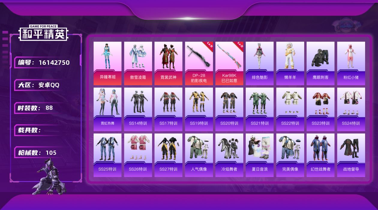 [16142750]【特价出售/店主推荐】安卓 手Q-3粉装-2特效枪-0载具-1粉色飞行器-29267热力值-4王牌印记-88套装-105枪皮 【热门品类】:套装-粉红小猪 【粉色套装】:粉装-傲雪凌霜,粉装-霓裳武神,角色-异瞳寒姬 【粉色枪皮等级】:Kar98K-巳巳如意(五级),DP-28-豹影疾电(五级) 【粉色枪皮】:Kar98K-巳巳如意,DP-28-豹影疾电 【粉色降落伞】:精灵梦叶罗丽降落伞,喜羊羊与灰太狼降落伞,炫彩糖果降落伞 【稀有套装】:套装-霓虹热舞,玩偶服-懒羊羊,角色-绯色魅影,套装-炫彩糖果 【稀有枪皮】:AUG-冰晶雪宝,AKM-夜灯,AKM-环太平洋,AKM-生命誓言,AKM-破晓战魂,AKM-虎虎生威,M16A4-幻世战舞者,SCAR-L-暗夜玫瑰,SCAR-L-炫彩节奏,SCAR-L-玉兔迎春,M416-糯团青竹,M416-蓝色火焰,GROZA-彩虹符号,AUG-耀粉歌者,QBZ-彩虹符号,M762-天降萌叽,Mk47-妙红点点,G36C-星穹咏叹调,AC-VAL-天降萌叽,蜜獾-娇憨猪猪,UZI-啾咪啾咪,UZI-娇憨猪猪,UZI-炫彩节奏,UMP45-生命誓言,UMP45-蓝色火焰,Vector-彩虹符号,Vector-生命誓言,Vector-音爆索尼克,汤姆逊-天降萌叽,汤姆逊-环太平洋,汤姆逊-耀粉歌者,Kar98K-炫彩节奏,Kar98K-王子的夏天,AWM-海螺星光,AWM-音爆索尼克,SKS-炫彩节奏,Mini14-穿刺龙虾,Mini14-耀粉歌者,SLR-娇憨猪猪,AMR-妙红点点,S686-生命誓言,S686-红色方程式,S1897-炫彩节奏,S12K-瑞龙福将,S12K-破晓战魂,S12K-娇憨猪猪,S12K-幻世战舞者,DBS-彩虹符号,DBS-第五大道,M249-妙红点点,M249-彩虹符号,DP-28-彩虹符号,MG3-妙红点点,MG3-幻世战舞者,MG3-暗夜行者,爆炸猎弓-喜羊羊与灰太狼 【其他套装】:套装-SS14特训,套装-SS17特训,套装-SS19特训,套装-SS20特训,套装-SS21特训,套装-SS22特训,套装-SS23特训,套装-SS24特训,套装-SS25特训,套装-SS26特训,套装-SS27特训,套装-人气偶像,套装-冷焰舞者,套装-夏日音浪,套装-完美偶像,套装-幻世战舞者,套装-战地督导,