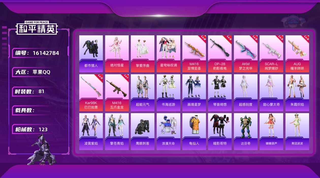 [16142784]【店主推荐捡漏号!可直接换绑】苹果 手Q-3粉装-8特效枪-0载具-3粉色飞行器-38603热力值-6王牌印记-81套装-123枪皮【热门品类】:套装-浪漫天命,套装-都市猎人,套装-龟仙人,套装-暗影哥特【粉色套装】:角色-绝对恒星,粉装-挚爱序曲,粉装-星穹咏叹调【粉色枪皮等级】:AKM-梦之光华(五级),SCAR-L-纯梦嫁纱(五级),M416-五爪金龙(一级),M416-至情至圣(八级),AUG-暖羊咩咩(五级),AKS-74U-森灵之息(五级),Kar98K-巳巳如意(五级),DP-28-豹影疾电(五级)【粉色枪皮】:AKM-梦之光华,SCAR-L-纯梦嫁纱,M416-五爪金龙,M416-至情至圣,AUG-暖羊咩咩,AKS-74U-森灵之息,Kar98K-巳巳如意,DP-28-豹影疾电【粉色飞行器】:绝对恒星飞行器,极意拳锋飞行器