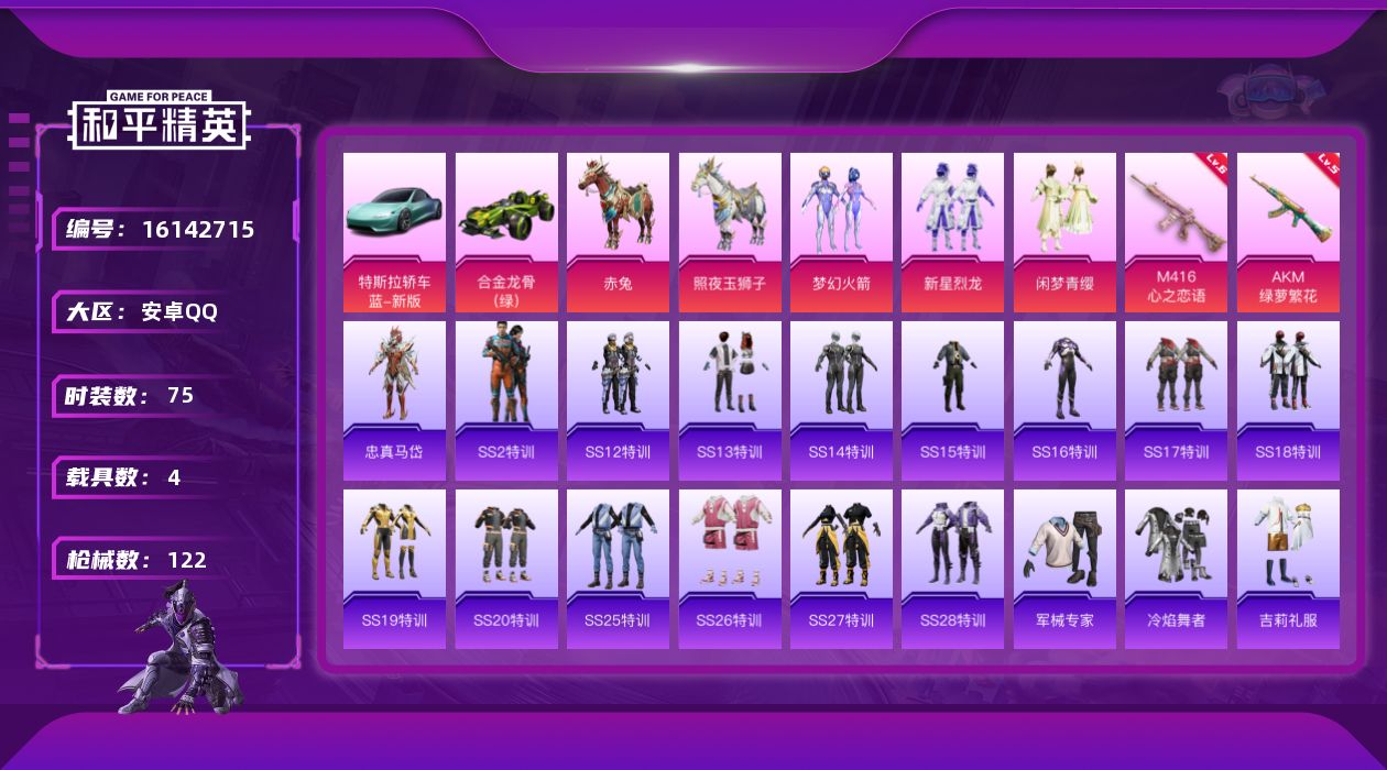 - [15147887]可二次【店主推荐捡漏号!可直接换绑】 安卓 手Q-4粉装-1特效枪-3载具-1w热力值-2王牌印记-20套装-16枪皮【粉色套装】:角色-白勺歌姬,角色-呆萌星弥,角色-小可学妹,角色-小叽联名款【粉色枪皮等级】:Kar98K-巳巳如意(一级)【粉色载具】:特斯拉Roadster(水滴蓝),特斯拉Cybertruck(极昼黑),特斯拉Cybertruck(荒芜蓝)
