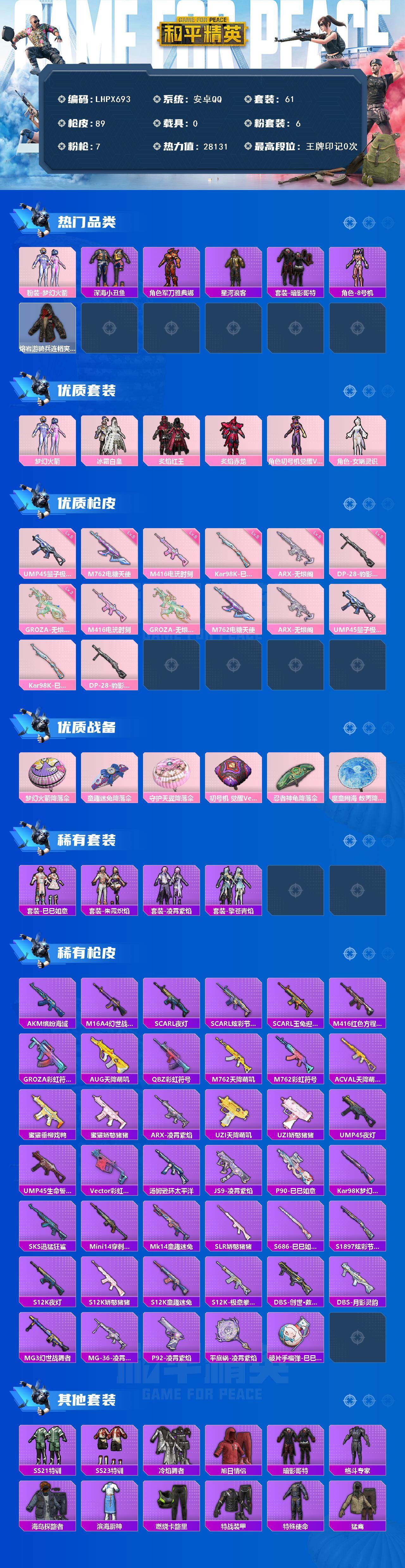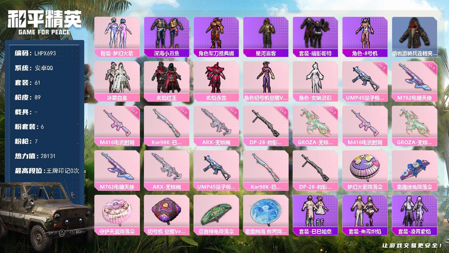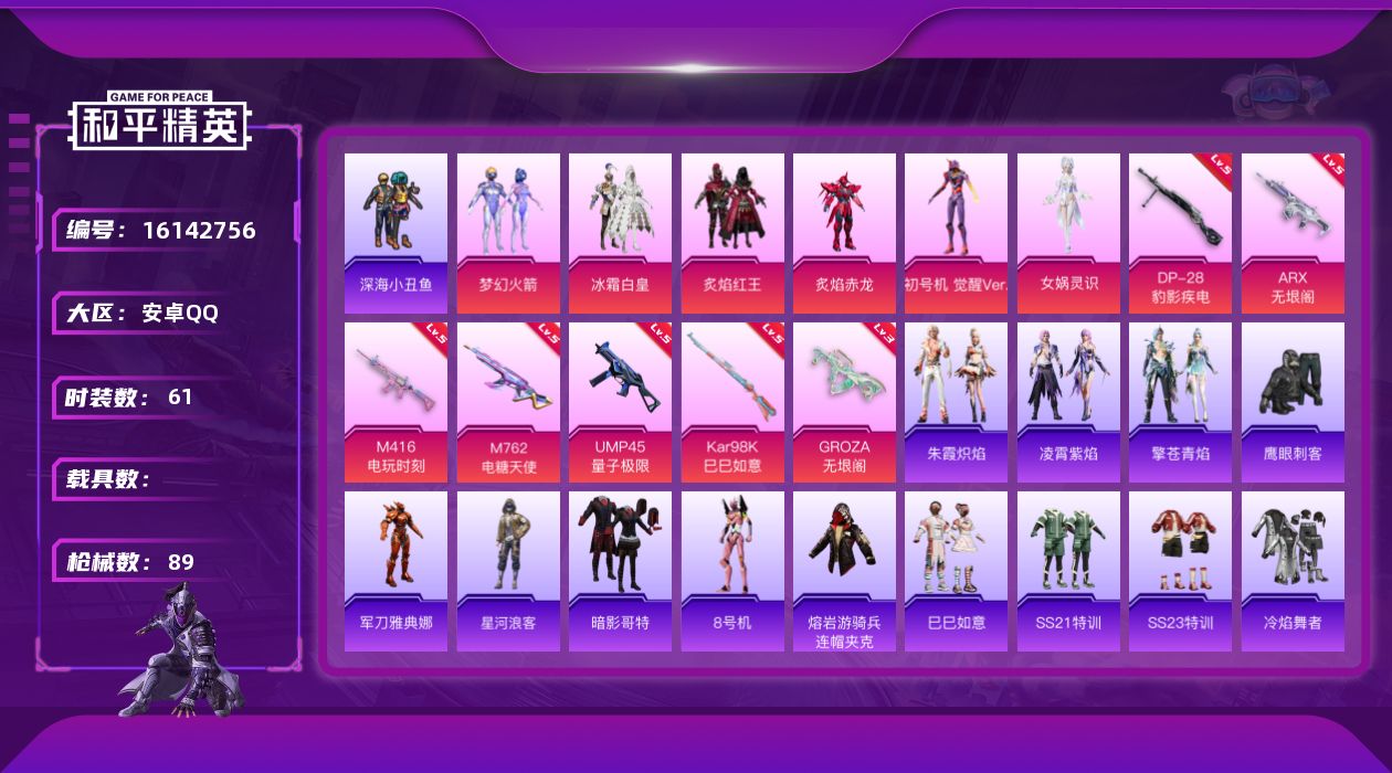 [16142756]【特价出售/店主推荐】安卓 手Q-6粉装-7特效枪-0载具-0粉色飞行器-28131热力值-1王牌印记-61套装-89枪皮 【热门品类】:粉装-梦幻火箭,套装-深海小丑鱼,角色-军刀雅典娜,套装-星河浪客,套装-暗影哥特,角色-8号机,熔岩游骑兵连帽夹克 【粉色套装】:粉装-梦幻火箭,粉装-冰霜白皇,粉装-炙焰红王,粉装-炙焰赤龙,角色-初号机 觉醒Ver.,角色-女娲灵识 【粉色枪皮等级】:M416-电玩时刻(五级),GROZA-无垠阁(三级),M762-电糖天使(五级),ARX-无垠阁(五级),UMP45-量子极限(五级),Kar98K-巳巳如意(五级),DP-28-豹影疾电(五级) 【粉色枪皮】:M416-电玩时刻,GROZA-无垠阁,M762-电糖天使,ARX-无垠阁,UMP45-量子极限,Kar98K-巳巳如意,DP-28-豹影疾电 【粉色降落伞】:梦幻火箭降落伞,童趣迷兔降落伞,守护天翼降落伞,初号机 觉醒Ver.降落伞,忍者神龟降落伞,魔童闹海 敖丙降落伞 【稀有套装】:套装-巳巳如意,套装-雪国风尚,套装-朱霞炽焰,套装-凌霄紫焰,套装-擎苍青焰 【稀有枪皮】:AKM-缤纷海域,M16A4-幻世战舞者,SCAR-L-夜灯,SCAR-L-炫彩节奏,SCAR-L-玉兔迎春,M416-红色方程式,GROZA-彩虹符号,AUG-天降萌叽,QBZ-彩虹符号,M762-天降萌叽,M762-彩虹符号,AC-VAL-天降萌叽,蜜獾-垂柳戏鸭,蜜獾-娇憨猪猪,ARX-凌霄紫焰,UZI-天降萌叽,UZI-娇憨猪猪,UMP45-夜灯,UMP45-生命誓言,Vector-彩虹符号,汤姆逊-环太平洋,JS9-凌霄紫焰,P90-巳巳如意,Kar98K-梦幻火箭,SKS-迅猛狂鲨,Mini14-穿刺龙虾,Mk14-童趣迷兔,SLR-娇憨猪猪,S686-巳巳如意,S1897-炫彩节奏,S12K-童趣迷兔,S12K-夜灯,S12K-娇憨猪猪,S12K-极意拳锋,DBS-创世·救赎,DBS-月影灵韵,MG3-幻世战舞者,MG-36-凌霄紫焰,P92-凌霄紫焰,平底锅-凌霄紫焰,破片手榴弹-巳巳如意 【其他套装】:套装-SS21特训,套装-SS23特训,套装-冷焰舞者,套装-旭日情侣,套装-暗影哥特,套装-格斗专家,套装-海岛探路者,套装-滨海厨神,套装-燃烧卡路里,套装-特战装甲,套