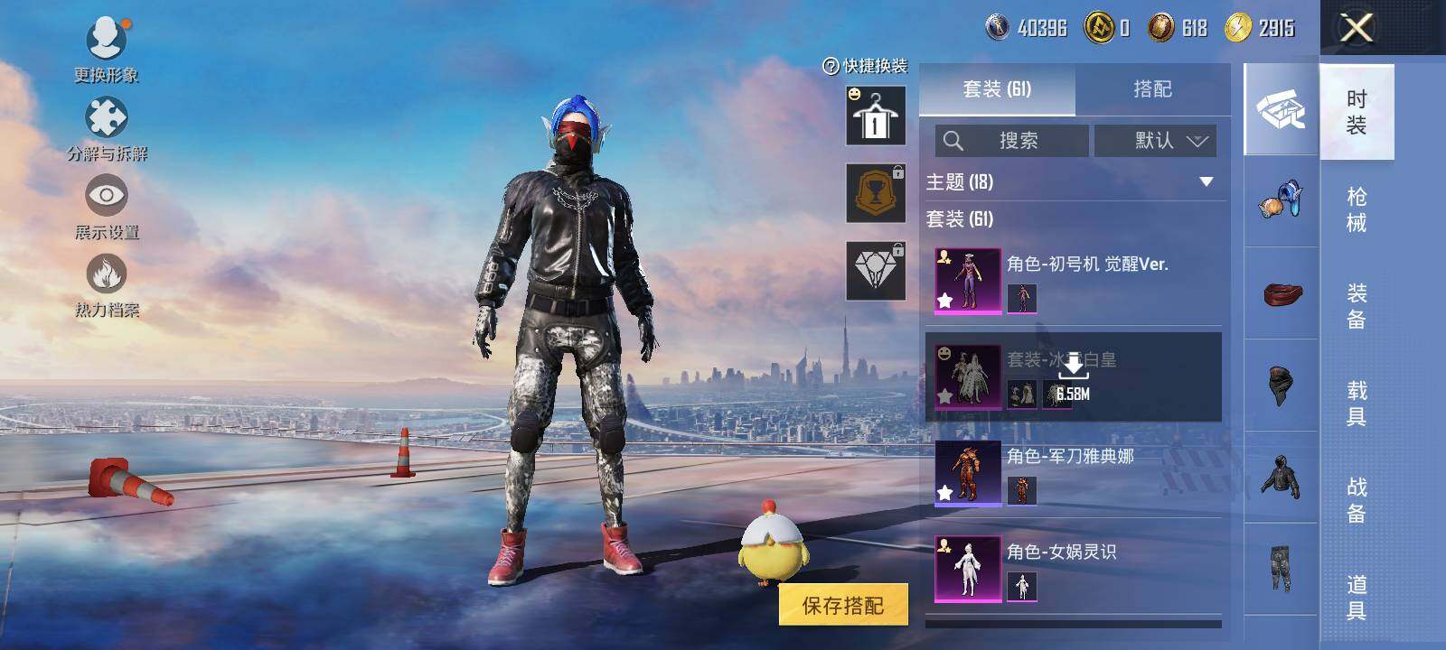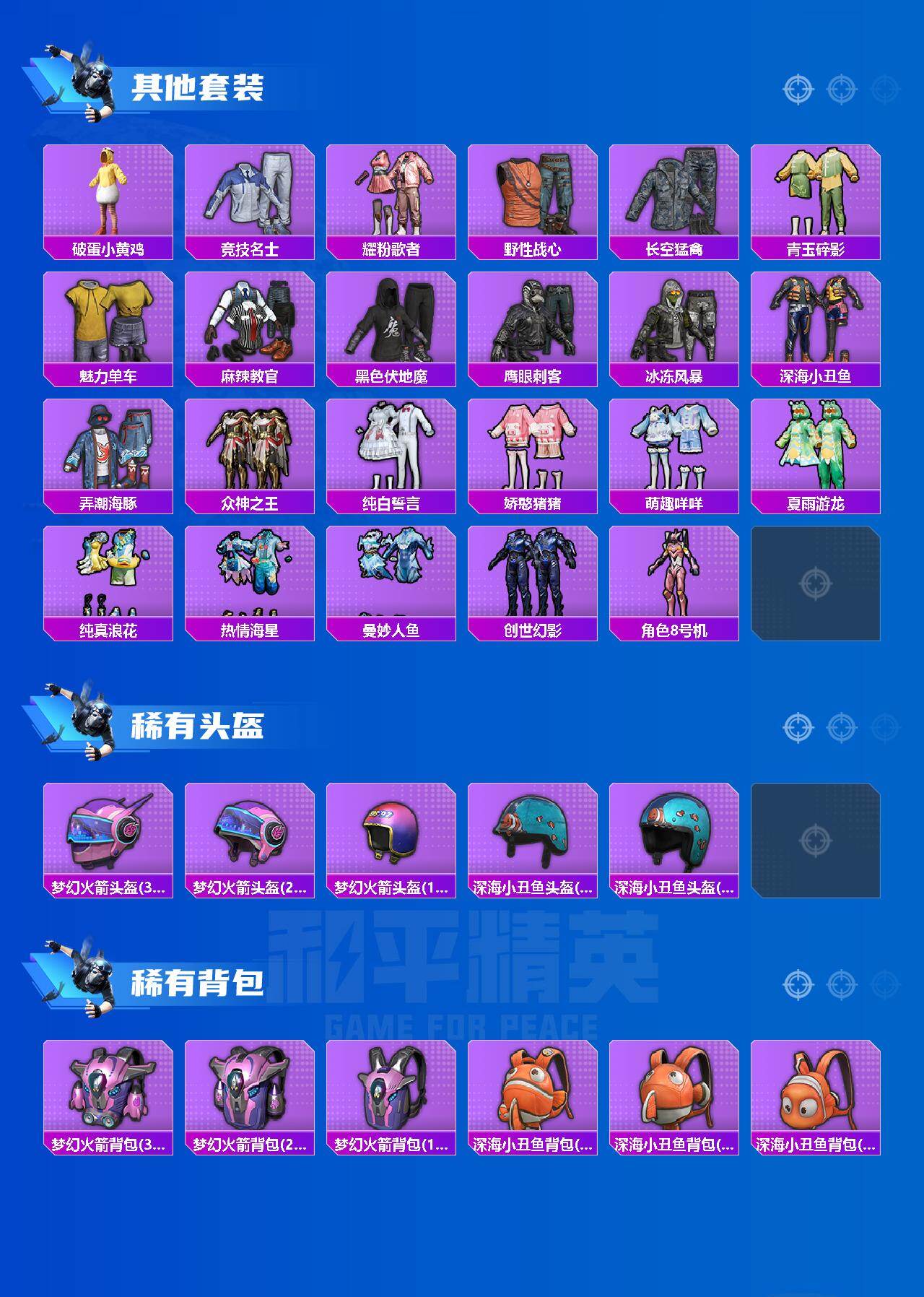 套装-梦幻火箭,套装-深海小丑鱼,套装-炙焰红王,套装-炙焰赤龙,角色-觉醒初号机,角色-女娲灵识,套装-鹰眼刺客