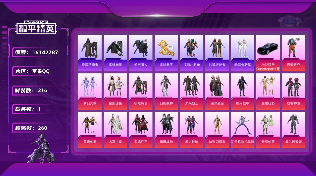[16142787]【特价出售/店主推荐】苹果 手Q-22粉装-12特效枪-1载具-6粉色飞行器-100038热力值-12王牌印记-216套装-260枪皮