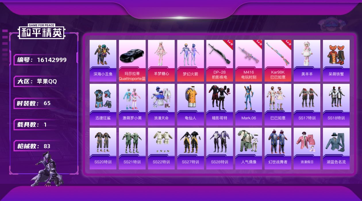 [16142999]【特价出售/店主推荐】苹果 手Q-2粉装-3特效枪-1载具-1粉色飞行器-2.6w热力值-5王牌印记-65套装-83枪皮 【热门品类】:粉装-梦幻火箭,套装-浪漫天命,套装-深海小丑鱼,套装-龟仙人,套装-暗影哥特,角色-Mark.06 【粉色套装】:粉装-梦幻火箭,角色-羊梦糖心 【粉色枪皮等级】:M416-电玩时刻(五级),Kar98K-巳巳如意(五级),DP-28-豹影疾电(五级) 【粉色载具】:玛莎拉蒂Quattroporte(夜幕蓝) 【粉色枪皮】:M416-电玩时刻,Kar98K-巳巳如意,DP-28-豹影疾电 【粉色降落伞】:梦幻火箭降落伞,暗夜玫瑰降落伞,江南烟雨降落伞,初号机 觉醒Ver.降落伞,喜羊羊与灰太狼降落伞,炫彩糖果降落伞 【稀有套装】:套装-龟仙人,套装-巳巳如意,套装-炫彩糖果,玩偶服-美羊羊 【稀有枪皮】:AUG-冰晶雪宝,AKM-环太平洋,AKM-生命誓言,AKM-破晓战魂,AKM-虎虎生威,AKM-霓虹街区,M16A4-甜心亚梦,SCAR-L-炫彩节奏,SCAR-L-玉兔迎春,SCAR-L-红色方程式,M416-红色方程式,GROZA-异彩先驱,AUG-耀粉歌者,QBZ-彩虹符号,M762-天降萌叽,M762-瑞龙福将,AC-VAL-天降萌叽,AC-VAL-甜心亚梦,蜜獾-天降萌叽,蜜獾-娇憨猪猪,UZI-啾咪啾咪,UZI-娇憨猪猪,UZI-炫彩节奏,UMP45-蓝色火焰,汤姆逊-天降萌叽,汤姆逊-环太平洋,汤姆逊-耀粉歌者,AKS-74U-鬼刀,P90-飞驰魅影,P90-巳巳如意,Kar98K-梦幻火箭,SKS-炫彩节奏,SKS-迅猛狂鲨,Mini14-梦幻火箭,Mini14-耀粉歌者,Win94-瑞龙福将,SLR-娇憨猪猪,M417-惊鸿侠骨,M200-惊鸿侠骨,S686-红色方程式,S1897-炫彩节奏,S12K-瑞龙福将,S12K-娇憨猪猪,DBS-甜心亚梦,M249-彩虹符号,DP-28-甜心亚梦,MG3-幻世战舞者,MG3-惊鸿侠骨,MG3-瑞龙福将,蝎式手枪-闲梦青缨,爆炸猎弓-惊鸿侠骨,破片手榴弹-巳巳如意 【其他套装】:套装-SS17特训,套装-SS18特训,套装-SS20特训,套装-SS21特训,套装-SS22特训,套装-SS27特训,套装-SS28特训,套装-人气偶像,套装-幻世战舞者,套装-暗影哥特,套