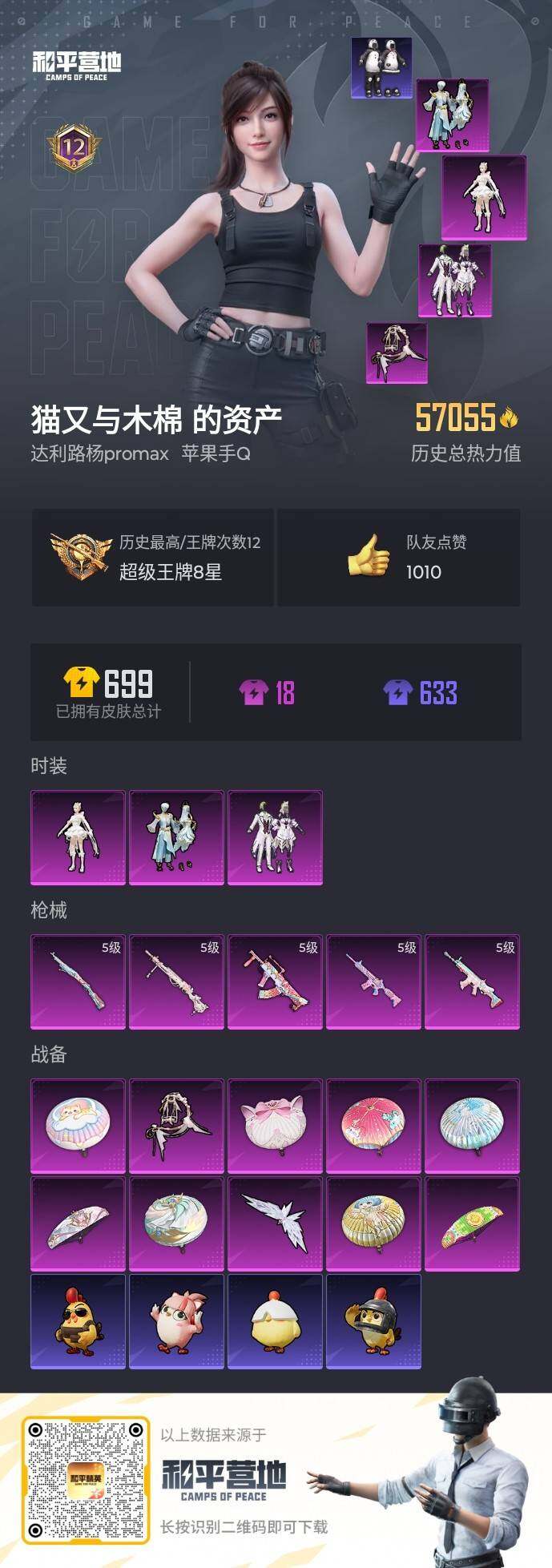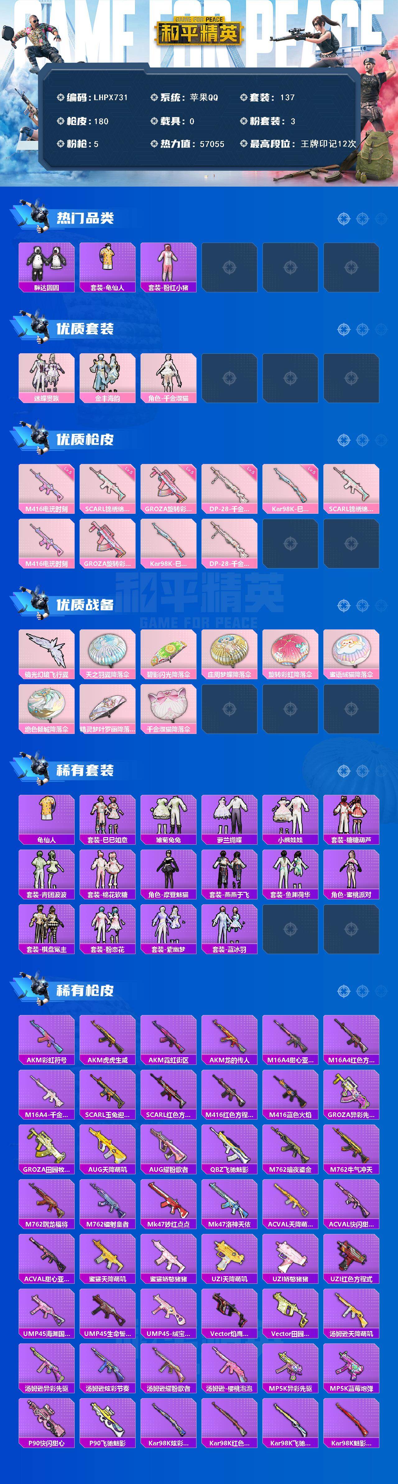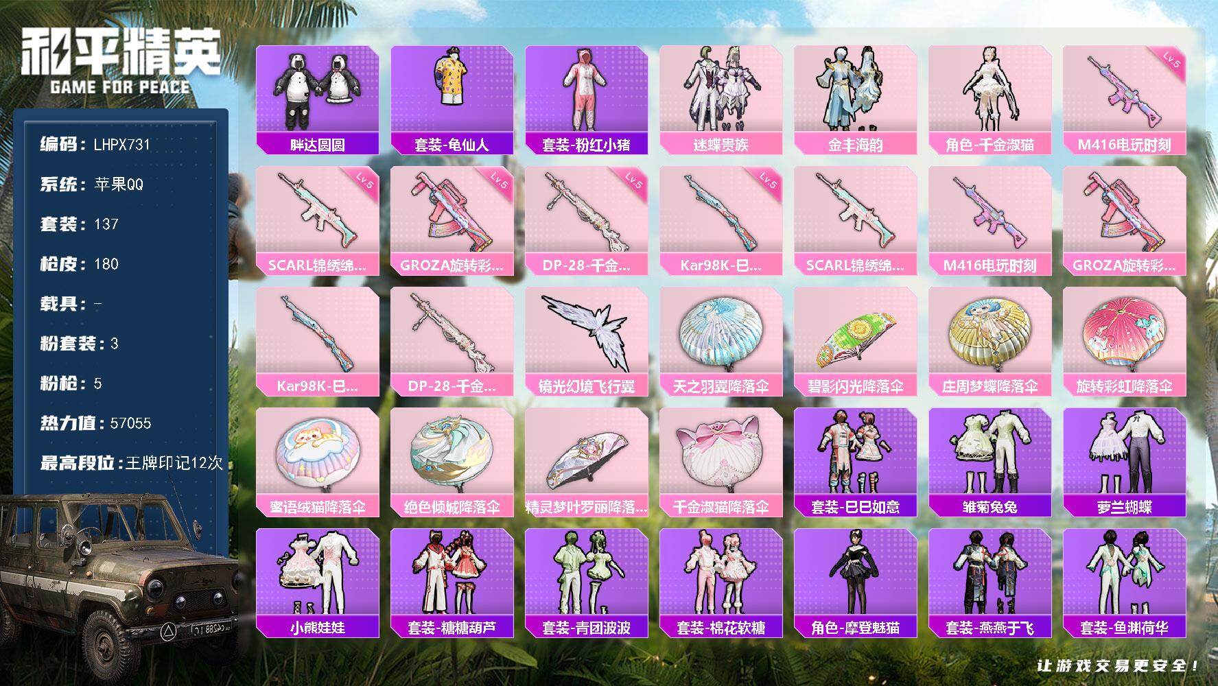 [16142876]【店主推荐捡漏号!可直接换绑】苹果 手Q-3粉装-5特效枪-0载具-2粉色飞行器-57055热力值-12王牌印记-137套装-180枪皮【热门品类】:套装-胖达圆圆,套装-龟仙人,套装-粉红小猪【粉色套装】:粉装-迷蝶贵族,粉装-金丰海韵,角色-千金淑猫【粉色枪皮等级】:SCAR-L-锦绣绵绵(五级),M416-电玩时刻(五级),GROZA-旋转彩虹(五级),Kar98K-巳巳如意(五级),DP-28-千金淑猫(五级)【粉色枪皮】:SCAR-L-锦绣绵绵,M416-电玩时刻,GROZA-旋转彩虹,Kar98K-巳巳如意,DP-28-千金淑猫【粉色飞行器】:镜光幻境飞行翼