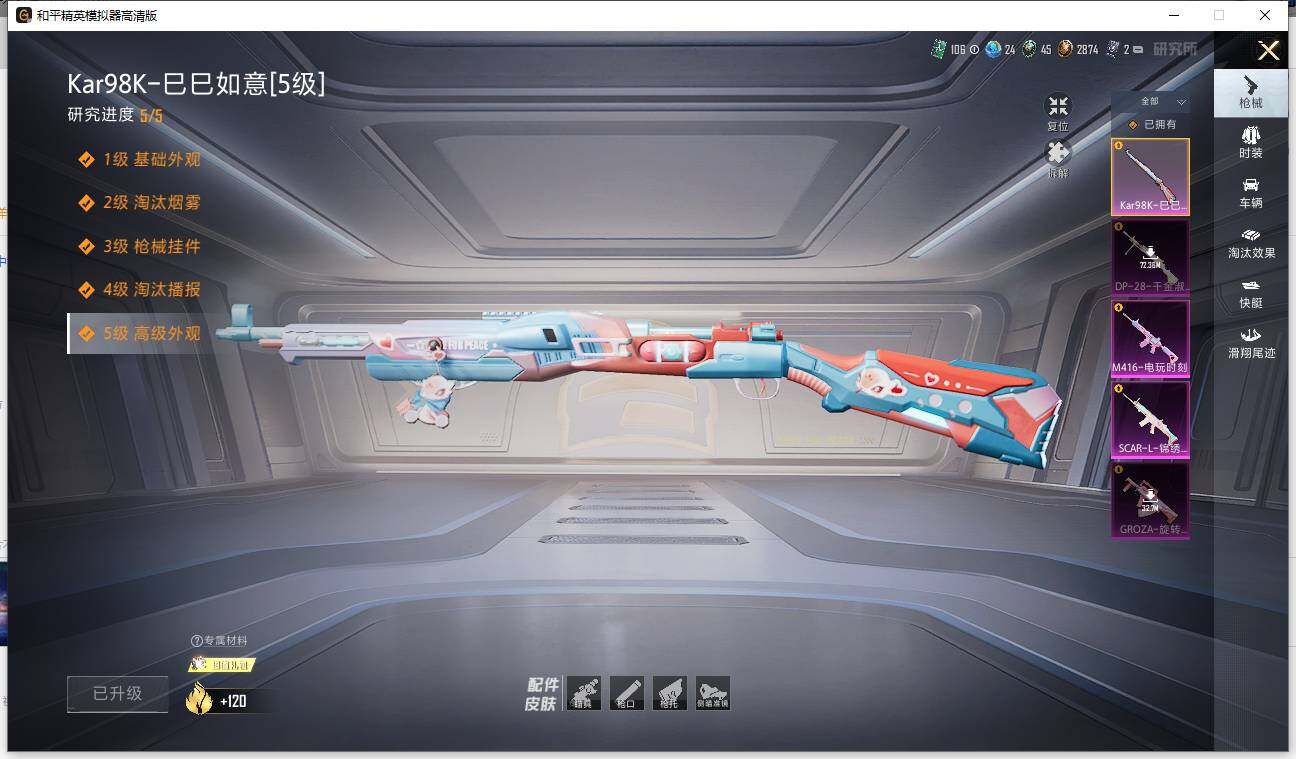 SCAR-L-锦绣绵绵,M416-电玩时刻,GROZA-旋转彩虹,Kar98K-巳巳如意,DP-28-千金淑猫