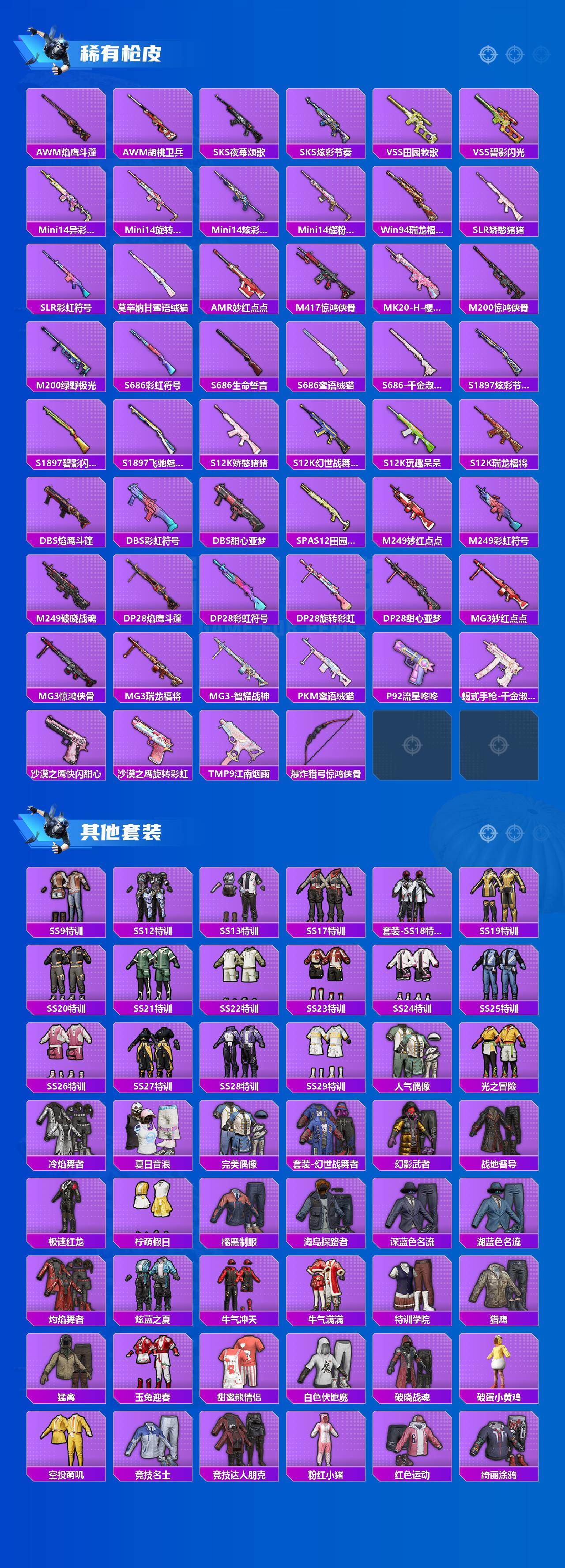 - [15150333]【特价出售/店主推荐】苹果 微信-3粉装-2特效枪-1载具-2粉色飞行器-5.1w热力值-9王牌印记-145套装-164枪皮 【热门品类】:套装-深海小丑鱼,角色-忠猛周仓,套装-龟仙人,角色-Mark.06,大砍刀-青龙偃月刀 【粉色套装】:角色-圣堂之誓,粉装-星穹咏叹调 【粉色枪皮等级】:Kar98K-巳巳如意(五级),DP-28-豹影疾电(五级) 【粉色载具】:保时捷918 Spyder(沉静蓝) 【粉色枪皮】:Kar98K-巳巳如意,DP-28-豹影疾电 【粉色飞行器】:夜幕颂歌飞行器 【粉色降落伞】:绝对恒星降落伞,百万伏特降落伞,第五大道降落伞,未来歌姬降落伞,超新星降落伞,圣堂之誓降落伞,蜜语绒猫降落伞,忍者神龟降落伞,千金淑猫降落伞,喜羊羊与灰太狼降落伞,炫彩糖果降落伞 【稀有套装】:套装-龟仙人,套装-绒宝小鹅,套装-巳巳如意,套装-小鸟芋圆,套装-雏菊兔兔,套装-萝兰蝴蝶,套装-小熊娃娃,套装-燕燕于飞,套装-鱼渊荷华,角色-海琴烟,套装-粉恋花,套装-紫幽梦,套装-蓝冰羽,玩偶服-懒羊羊,套装-炫彩糖果 【稀有枪皮】:AUG-冰晶雪宝,AKM-锦绣火鲤,AKM-龙的传人,M16A4-红色方程式,M16A4-蓝色火焰,SCAR-L-夜灯,SCAR-L-炫彩节奏,SCAR-L-红色方程式,M416-糯团青竹,M416-红色方程式,M416-蓝色火焰,GROZA-懵萌河马,AUG-耀粉歌者,QBZ-原初圣火,M762-牛气冲天,M762-镭射皇者,M762-登顶巅峰,G36C-懵萌河马,G36C-星穹咏叹调,AC-VAL-快闪甜心,AC-VAL-闲梦青缨,蜜獾-天降萌叽,UZI-啾咪啾咪,UZI-天降萌叽,UZI-红色方程式,UZI-幻影飞狐,UMP45-繁龙极客,UMP45-炫光之旅,UMP45-生命誓言,UMP45-蓝色火焰,Vector-焰鹰斗篷,汤姆逊-天降萌叽,汤姆逊-耀粉歌者,AKS-74U-鬼刀,P90-快闪甜心,P90-巳巳如意,Kar98K-彩虹符号,Kar98K-红色方程式,Kar98K-诡娃娃,M24-幻彩电音,AWM-焰鹰斗篷,AWM-圣堂之誓,SKS-未来歌姬,VSS-彩虹符号,VSS-镭射皇者,Mini14-原初圣火,Mini14-耀粉歌者,SLR-四圣焕新,QBU-锦绣火鲤,莫辛纳甘-懵萌河马,M417-惊鸿侠骨,M
