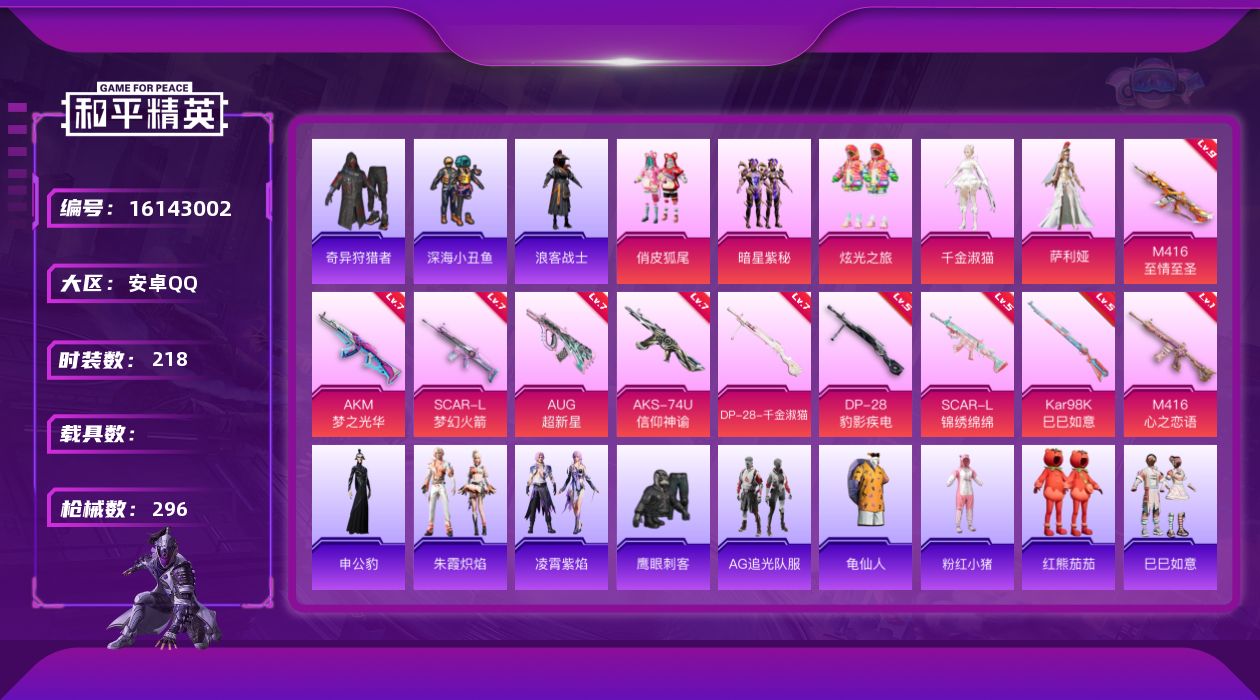 [16143002]【特价出售/店主推荐】安卓 手Q-无敌战神框-5粉装-10特效枪-0载具-4粉色飞行器-95399热力值-23王牌印记-218套装-296枪皮 【热门品类】:套装-深海小丑鱼,套装-奇异狩猎者,套装-浪客战士,套装-AG追光队服,套装-龟仙人,套装-粉红小猪,套装-红熊茄茄 【粉色套装】:粉装-俏皮狐尾,粉装-暗星紫秘,粉装-炫光之旅,角色-千金淑猫,角色-萨利娅 【粉色枪皮等级】:AKM-梦之光华(七级),SCAR-L-梦幻火箭(七级),SCAR-L-锦绣绵绵(五级),M416-心之恋语(一级),M416-至情至圣(九级),AUG-超新星(七级),AKS-74U-信仰神谕(七级),Kar98K-巳巳如意(五级),DP-28-千金淑猫(七级),DP-28-豹影疾电(五级) 【粉色枪皮】:AKM-梦之光华,SCAR-L-梦幻火箭,SCAR-L-锦绣绵绵,M416-心之恋语,M416-至情至圣,AUG-超新星,AKS-74U-信仰神谕,Kar98K-巳巳如意,DP-28-千金淑猫,DP-28-豹影疾电 【粉色飞行器】:梦幻火箭飞行器,心之恋语飞行翼,歌者泠鸢飞行器 【粉色降落伞】:粉色回忆降落伞,梦幻火箭降落伞,神秘黑猫降落伞,古堡领主降落伞,潮汐统领降落伞,阿狸红降落伞,银刃赛罗降落伞,童趣迷兔降落伞,香水柠檬降落伞,星之彼岸降落伞,洛神天依降落伞,蓝莓炮弹降落伞,暗星紫秘降落伞,环太平洋降落伞,垂柳戏鸭降落伞,霓虹漫游降落伞,精灵梦叶罗丽降落伞,信仰神谕降落伞,樱桃泡泡降落伞,无垠阁降落伞,异瞳寒姬降落伞,炫彩糖果降落伞 【稀有套装】:套装-龟仙人,套装-巳巳如意,套装-雪国风尚,套装-炫彩糖果,套装-雏菊兔兔,套装-萝兰蝴蝶,套装-糖糖葫芦,套装-青团波波,套装-裁决天象,套装-燕燕于飞,套装-鱼渊荷华,套装-镭金极速,角色-海琴烟,角色-蜜桃派对,角色-夜瞳黯灵,套装-朱霞炽焰,套装-凌霄紫焰,角色-申公豹 【稀有枪皮】:AUG-冰晶雪宝,AKM-夜灯,AKM-奇异狩猎者,AKM-彩虹符号,AKM-影袭,AKM-星之彼岸,AKM-玉龙,AKM-环太平洋,AKM-萌趣颜团子,AKM-虎虎生威,AKM-霓虹街区,AKM-龙的传人,M16A4-凝视深渊,M16A4-夜灯,M16A4-幻世战舞者,M16A4-快乐主宰,M16A4-魔法学院,M16A4-千金淑猫,SCA