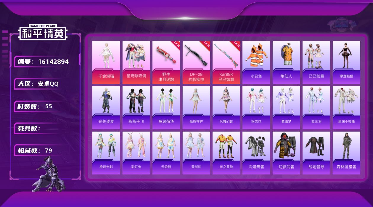 - [15332122]10英雄角色数-314英雄武器数 【王者系列】:王者之影,王者之心,王者之迹,王者之蝶,王者之兽,王者之狱,王者之魂,王者之霆,王者之业,王者之誉 【热门武器】:KSG-孟获,81式-光明之神,M4A1-仲达,AK47-常胜,M4A1-星象,AK47-游骑兵,M4A1-游骑兵,TAC-慈,M200-幻神,AWM-游骑兵,VEPR12-宙斯,COP 357-赤龙,黄金COP 357,COP 357-A,COP 357-绚樱*4,CZS2-仲康,AN94-盖 【角色】:幽灵刀锋-觉醒,樱,瞳,关小雨,职场灵狐-赛事经理,零-水下丽影,炽天使-X,零-新生,步练师,罗峰&巴巴塔-X 【英雄武器】:AK47-无影,AK47-火麒麟,AK47-麒麟,AK47-角斗士,AK47-耀金伯爵,AK47-游骑兵,AK47-常胜,AK47-樱斗士-二觉,AK47-竞技战魂,AK47-猩红传说,AK47-燎天净火,AK47-雷麒麟,AK47-心动次元,AK47-血武士,AK47-华夏传说,AK47-黑鲨,AK47-木兰,AK47-谜城烟火*2,M4A1-雷神*2,M4A1-黑骑士,M4A1-黑龙,M4A1-死神*2,M4A1-玫瑰精灵,M4A1-天使,M4A1-游骑兵,M4A1-枪娘,M4A1-星象,M4A1-雷神-萝拉,M4A1-龙血,M4A1-仲达,M4A1-机械迷城,M4A1-破空冰刃,M4A1-心动次元,M4A1-运输船*2,M4A1-猎神,M4A1-夏清,M4A1-太白诗仙*2,M4A1-铁胆虎魄,SCAR-幽暗骑士,SCAR Light-白虎,SCAR-探星者,SCAR-印刷术,SCAR-心动PICK,剑齿虎-炫彩,AN94-四凶觉醒,AN94-赳赳秦师,AN94-盖,AUG-机械纪元,9A91-天神,9A91-魔蜥觉醒,M14EBR-天神,M14EBR-拂影,M14EBR-葫芦山庄*2,M16-恶魔,AK12-天启,QBZ03-湮灭*2,QBZ03-金色蔷薇,QBZ03-死神*2,QBZ03-玉面羞花,HK416-极光,HK417-炎龙铠甲,81式-光明之神,MK47-云舞,G3A3-五色琉璃觉醒,G3A3-衍神兵*2,QBZ97-岚舞,QBZ97-浩瀚征途,QBZ191-金甲虎啸觉醒,QBZ191-封神榜,AWM-天龙,AWM-游骑兵,AWM-指南针,巴雷特-毁灭*2,