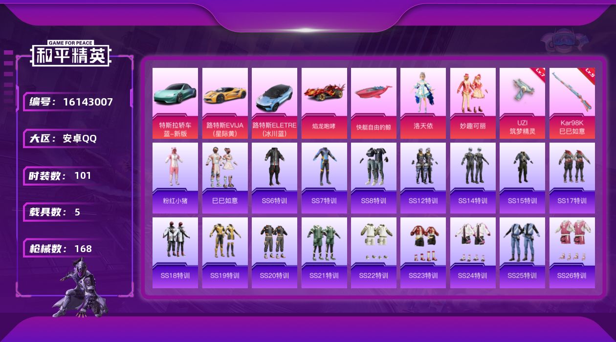 [16143007]【特价出售/店主推荐】安卓 手Q-2粉装-2特效枪-5载具-0粉色飞行器-52999热力值-12王牌印记-101套装-168枪皮 【热门品类】:套装-粉红小猪 【粉色套装】:角色-洛天依,粉装-妙趣可丽 【粉色枪皮等级】:UZI-筑梦精灵(七级),Kar98K-巳巳如意(五级) 【粉色载具】:特斯拉Roadster(水滴蓝),路特斯EVIJA(星际黄),路特斯ELETRE(冰川蓝),焰龙咆哮,快艇-自由的鲸 【粉色枪皮】:UZI-筑梦精灵,Kar98K-巳巳如意 【粉色降落伞】:未来战士降落伞,繁花小夜曲降落伞,洛神天依降落伞,歌者泠鸢降落伞,罪夜之冕降落伞 【稀有套装】:套装-巳巳如意,角色-月烬之祷 【稀有枪皮】:AKM-彩虹符号,AKM-灼热熔岩,AKM-破晓战魂,AKM-筑梦精灵,AKM-虎虎生威,AKM-霓虹街区,M16A4-幻世战舞者,M16A4-甜心亚梦,M16A4-红色方程式,M16A4-蓝色火焰,SCAR-L-炫彩节奏,SCAR-L-玉兔迎春,SCAR-L-红色方程式,SCAR-L-黄金龙骨,M416-月影鸳鸯,M416-糯团青竹,M416-红色方程式,M416-蓝色火焰,GROZA-异彩先驱,GROZA-恐龙拽拽,GROZA-懵萌河马,GROZA-田园牧歌,AUG-天降萌叽,AUG-纯梦嫁纱,AUG-耀粉歌者,QBZ-彩虹符号,QBZ-洛神天依,QBZ-飞驰魅影,M762-暗夜鎏金,M762-牛气冲天,M762-瑞龙福将,Mk47-妙红点点,Mk47-洛神天依,G36C-懵萌河马,G36C-炙焰牛王,G36C-星穹咏叹调,AC-VAL-天降萌叽,AC-VAL-彩虹甜喵,AC-VAL-甜心亚梦,蜜獾-天降萌叽,蜜獾-娇憨猪猪,UZI-天降萌叽,UZI-娇憨猪猪,UZI-炫彩节奏,UZI-红色方程式,UMP45-夜灯,UMP45-蓝色火焰,Vector-田园牧歌,汤姆逊-天降萌叽,汤姆逊-异彩先驱,汤姆逊-炫彩节奏,汤姆逊-耀粉歌者,野牛-机械英豪,MP5K-异彩先驱,P90-甜蜜旋律,P90-闪光银龙,P90-飞驰魅影,Kar98K-炫彩节奏,Kar98K-红色方程式,Kar98K-飞驰魅影,M24-炫彩节奏,AWM-不夜海上花,SKS-未来歌姬,SKS-炫彩节奏,VSS-彩虹符号,VSS-田园牧歌,Mini14-异彩先驱,Mini14-涂山之恋