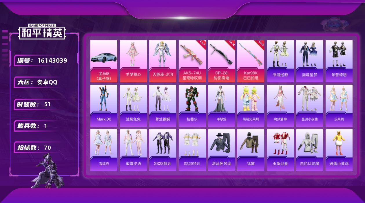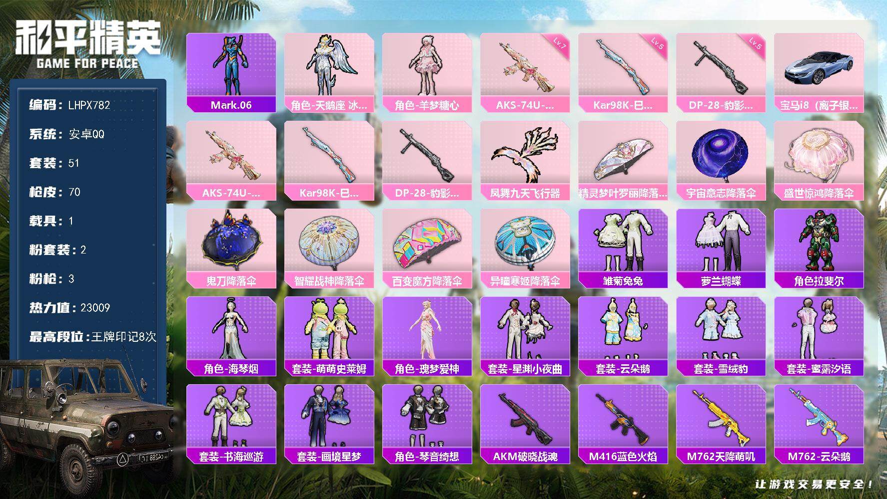 [16143039]【店主推荐捡漏号!可直接换绑】安卓 手Q-2粉装-3特效枪-1载具-1粉色飞行器-23009热力值-8王牌印记-51套装-70枪皮【热门品类】:角色-Mark.06【粉色套装】:角色-天鹅座 冰河,角色-羊梦糖心【粉色枪皮等级】:AKS-74U-星穹咏叹调(七级),Kar98K-巳巳如意(五级),DP-28-豹影疾电(五级)【粉色载具】:宝马i8(离子银)【粉色枪皮】:AKS-74U-星穹咏叹调,Kar98K-巳巳如意,DP-28-豹影疾电【粉色飞行器】:凤舞九天飞行器