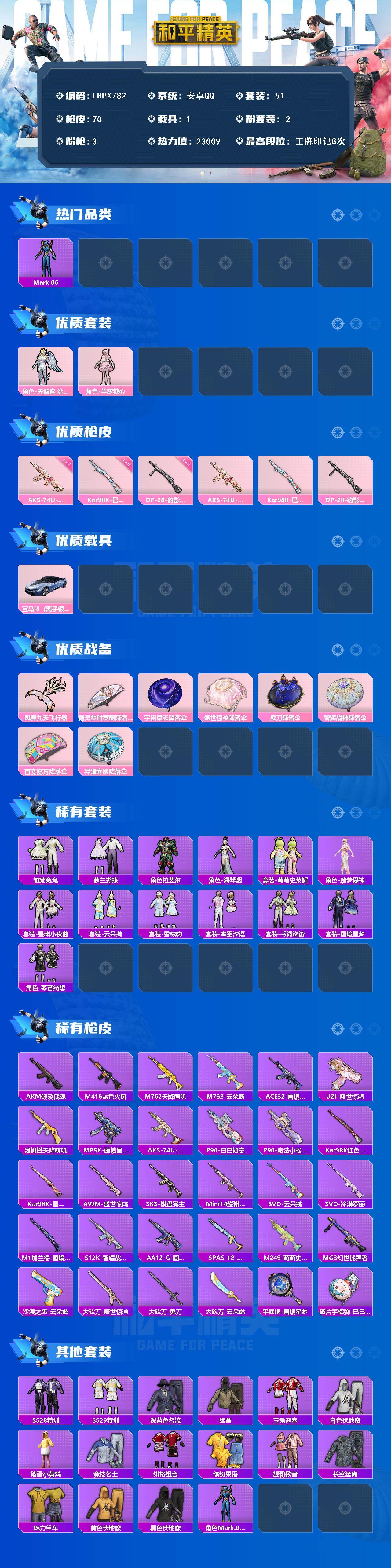 - [15340094]【1665】安卓 手Q-9粉装-11特效枪-0载具-5粉色飞行器-86119热力值-17王牌印记-199套装-259枪皮 【热门品类】:套装-浪漫天命,套装-都市猎人,套装-深海小丑鱼,套装-奇异狩猎者,套装-天网终结者,套装-忍者信条,套装-动感兔斯基人偶服,套装-暗夜之虎,套装-暗影哥特,角色-Mark.06,熔岩游骑兵连帽夹克 【粉色套装】:角色-绝对恒星,粉装-极限特训,粉装-幻影战神,粉装-粉色回忆,粉装-绚金战神,粉装-炙焰牛王,粉装-霞光圣骑,角色-烟云彩露,角色-樱桃泡泡 【粉色枪皮等级】:SCAR-L-青春物语(七级),M416-风花雪月(七级),M416-女娲灵识(三级),GROZA-镜光银凌(五级),AUG-暖羊咩咩(五级),Kar98K-巳巳如意(五级),AMR-智耀战神(六级),MK12-雪月幻音(四级),M249-绝对恒星(三级),DP-28-豹影疾电(五级),PKM-天星战神(七级) 【粉色枪皮】:SCAR-L-青春物语,M416-风花雪月,M416-女娲灵识,GROZA-镜光银凌,AUG-暖羊咩咩,Kar98K-巳巳如意,AMR-智耀战神,MK12-雪月幻音,M249-绝对恒星,DP-28-豹影疾电,PKM-天星战神 【粉色飞行器】:绝对恒星飞行器,绿意幻情飞行器,星夜魔法师飞行翼,太空嘟嘟飞行器 【粉色降落伞】:绝对恒星降落伞,极限特训降落伞,幻影战神降落伞,粉色回忆降落伞,齐天大圣降落伞,洛神天依降落伞,蓝莓炮弹降落伞,恐龙拽拽降落伞,黄族统领降落伞,未来歌姬降落伞,金丰海韵降落伞,千金淑猫降落伞,鬼刀降落伞,晶梦幻蝶降落伞,雪月幻音降落伞,智耀战神降落伞,冷漠罗丽降落伞,异瞳寒姬降落伞,炫彩糖果降落伞 【稀有套装】:套装-巳巳如意,角色-超感刻度,角色-甜心蒙太奇,套装-雪国风尚,套装-糖糖葫芦,套装-青团波波,角色-许七安,套装-燕燕于飞,套装-鱼渊荷华,角色-蜜桃派对,套装-粉恋花,套装-紫幽梦,套装-蓝冰羽,套装-星影赞美诗,套装-朱霞炽焰,套装-凌霄紫焰,套装-擎苍青焰,玩偶服-喜羊羊,角色-申公豹,角色-绯色魅影,角色-紫俏灵猫,套装-炫彩糖果 【稀有枪皮】:AUG-冰晶雪宝,AKM-彩虹符号,AKM-影袭,AKM-灼热熔岩,AKM-破晓战魂,AKM-缤纷海域,AKM-虎虎生威,AKM-霓虹街区,AKM-龙的传人,M