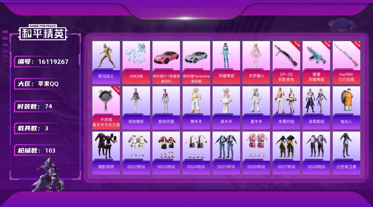 [16119267]【特价出售/店主推荐】苹果 手Q-无敌战神框-2粉装-4特效枪-3载具-2粉色飞行器-32778热力值-8王牌印记-74套装-103枪皮 【热门品类】:套装-冥河战士,套装-龟仙人,套装-暗影哥特,M416-星际漫游 【粉色套装】:角色-羊梦糖心,角色-异瞳寒姬 【粉色枪皮等级】:蜜獾-异瞳寒姬(四级),Kar98K-巳巳如意(四级),DP-28-豹影疾电(五级),平底锅-喜羊羊与灰太狼(三级) 【粉色载具】:保时捷911 敞篷版(星珀红),保时捷Panamera(星辰紫),冰绡玉鳞 【粉色枪皮】:蜜獾-异瞳寒姬,Kar98K-巳巳如意,DP-28-豹影疾电,平底锅-喜羊羊与灰太狼 【粉色飞行器】:飞天猪飞行器 【粉色降落伞】:绝对恒星降落伞,怪笑疯兔降落伞,圣堂之誓降落伞,精灵梦叶罗丽降落伞,绯穹魔姬降落伞,喜羊羊与灰太狼降落伞,魔童闹海 哪吒降落伞,异瞳寒姬降落伞,炫彩糖果降落伞 【稀有套装】:套装-龟仙人,套装-雪国风尚,套装-炫彩糖果,套装-朱霞炽焰,套装-凌霄紫焰,玩偶服-懒羊羊,玩偶服-美羊羊,玩偶服-喜羊羊,角色-绯色魅影,角色-紫俏灵猫 【稀有枪皮】:AUG-冰晶雪宝,AKM-破晓战魂,AKM-龙的传人,M16A4-冥河战士,M16A4-幻世战舞者,M16A4-星际漫游,SCAR-L-红色方程式,M416-星际漫游,M416-糯团青竹,M416-绿野极光,M416-蓝色火焰,GROZA-田园牧歌,AUG-耀粉歌者,QBZ-彩虹符号,M762-天降萌叽,M762-第五大道,Mk47-妙红点点,G36C-星际漫游,AC-VAL-天降萌叽,蜜獾-天降萌叽,ARX-凌霄紫焰,UZI-啾咪啾咪,UMP45-星际漫游,UMP45-蓝色火焰,Vector-田园牧歌,Vector-音爆索尼克,汤姆逊-耀粉歌者,JS9-凌霄紫焰,Kar98K-彩虹符号,SKS-糯团青竹,VSS-田园牧歌,Mini14-星际漫游,AMR-妙红点点,AMR-喜羊羊与灰太狼,DBS-圣堂之誓,SPAS-12-田园牧歌,M249-妙红点点,M249-彩虹符号,MG3-妙红点点,MG3-幻世战舞者,MG3-第五大道,MG-36-凌霄紫焰,P92-凌霄紫焰,爆炸猎弓-喜羊羊与灰太狼,平底锅-凌霄紫焰 【其他套装】:套装-4AM战队服,套装-SS22特训,套装-SS23特训,套装-SS24特训,